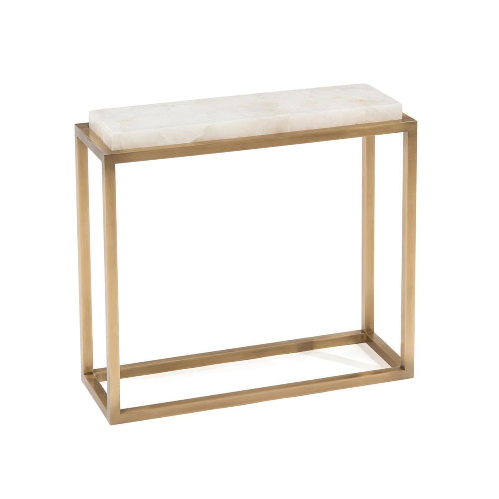 Description: A rectangular accent table has a calcite top and an antique brass base.