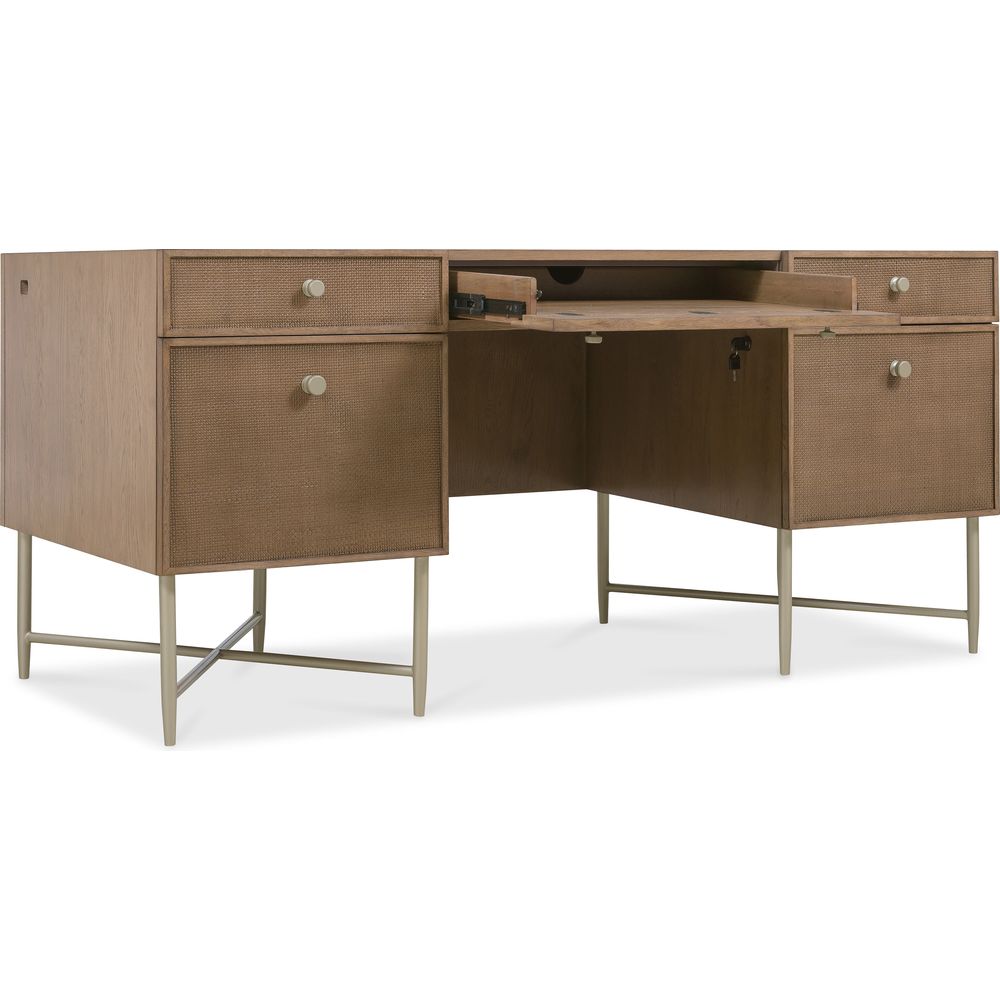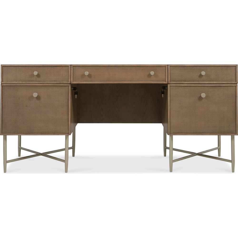 Description: Mixing Quartered, Cathedral-Cut Oak in an earthen-toned finish with cane-front drawers and a metal base, stretchers and tapered legs, the Sonnet Executive Desk blends natural textures with a refined minimalist silhouette. The five drawers have cane-inset fronts, and there's a removable/interchangeable writing surface and pencil tray that can be used in either the right or left top drawer. Each of the top side drawers has two removable partitions. The center drawer has a drop-front writing surface and wire management. Two locking file drawers have a Pendaflex letter/legal filing system.