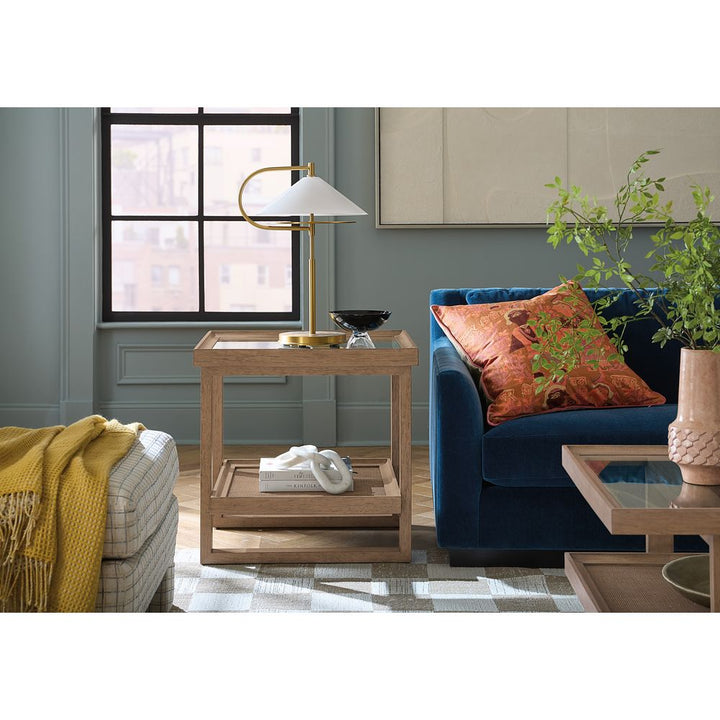 Description: Blending organic textures and neutral tones with a refined minimalist silhouette, the stylistically versatile Sonnet End Table exudes a natural luxury. The transparent tempered glass insert top reveals the lower fixed shelf with cane insert. The frame of the table is Quartered and Cathedral-Cut White Oak Veneers in a light earthen-toned finish. 26 inches square.