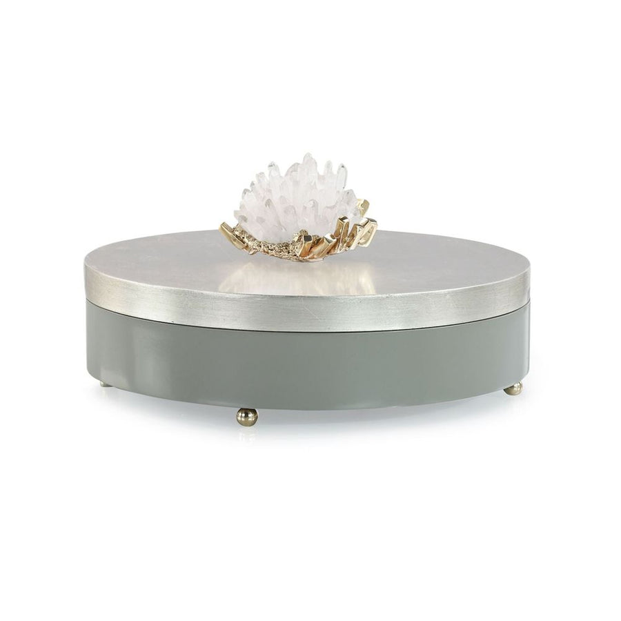 The Sophia Box is an elegant home accessory, imbuing an interior space with pristine tones and sweeping flourishes. The box features a round shape and displays gorgeous tones of gray and silver. The lid showcases a natural white crystal nested within a brass accent, matched by four spherical stands. The box features a removable insert, revealing 4 storage compartments.