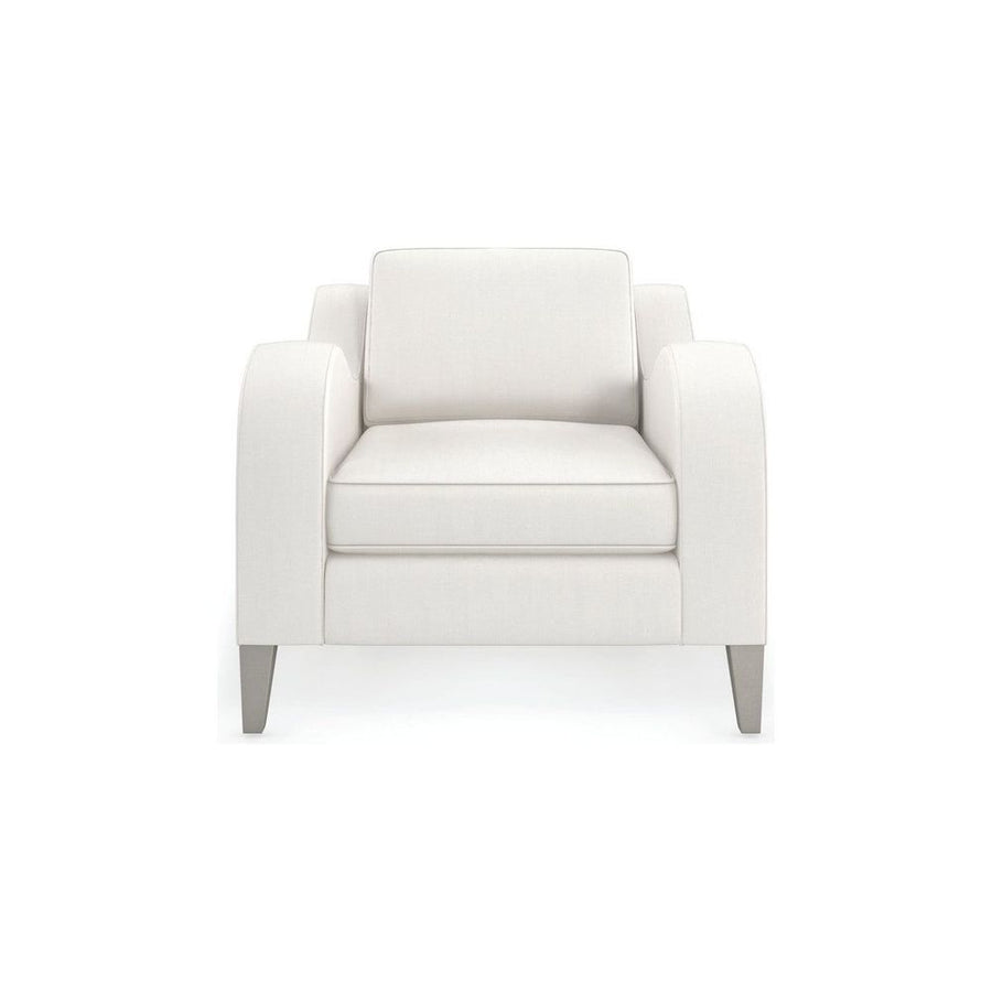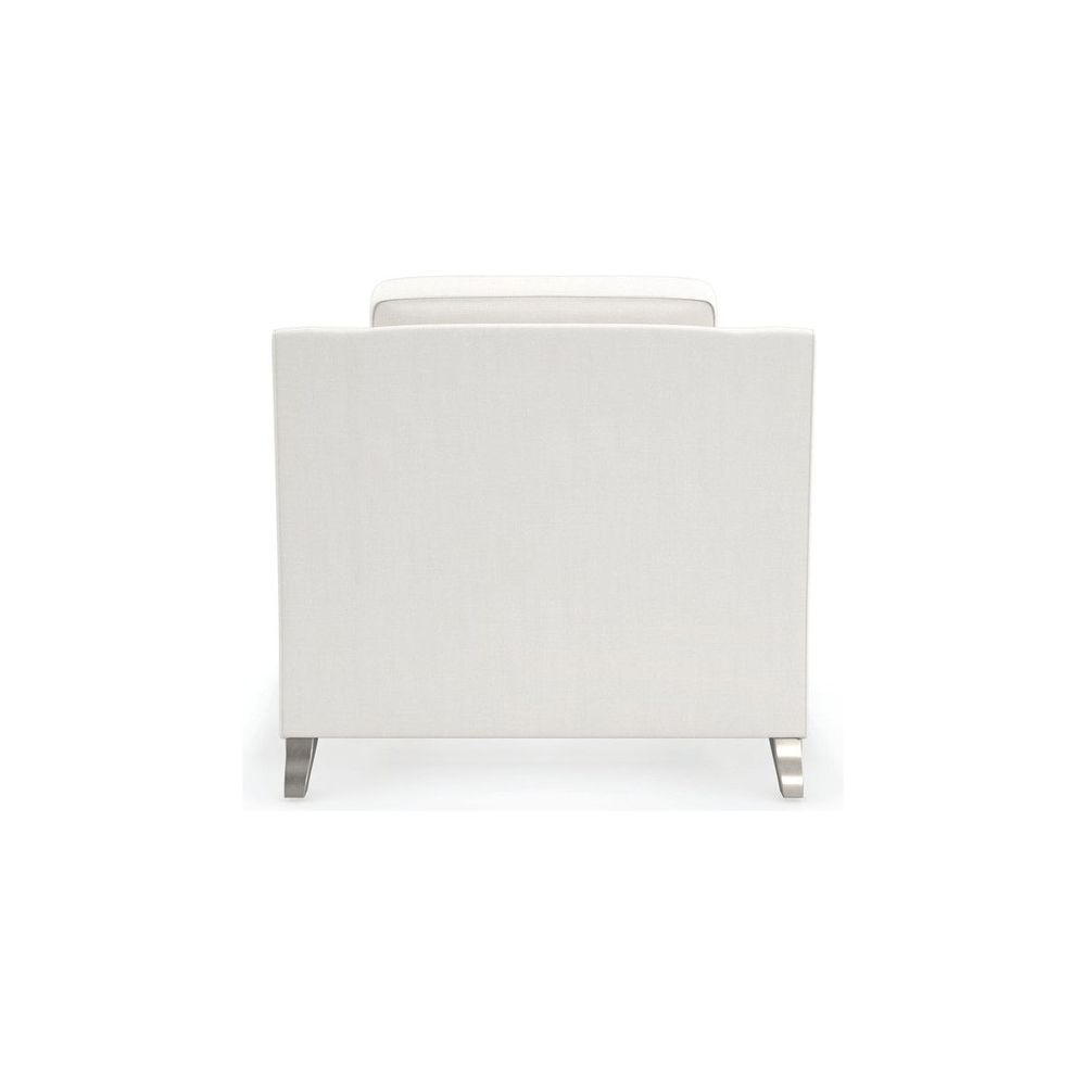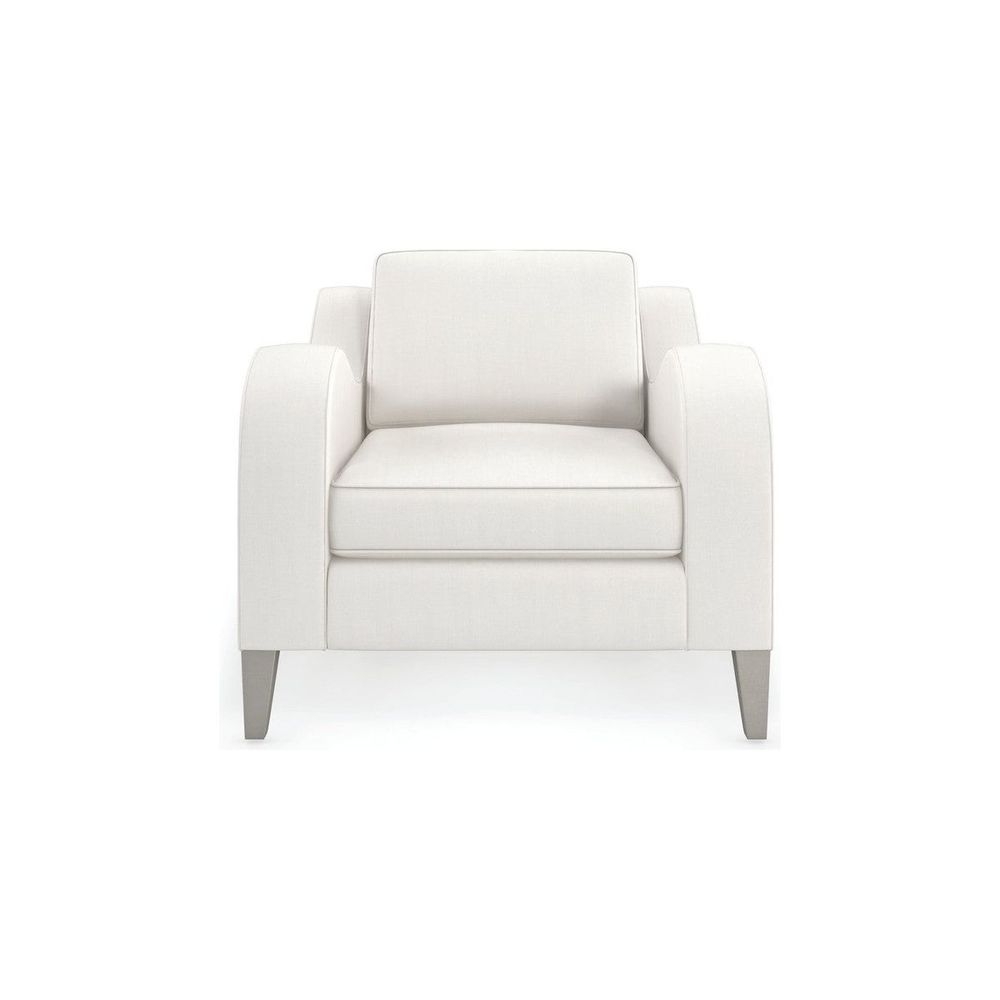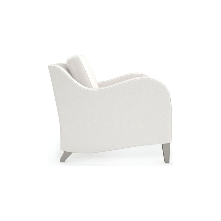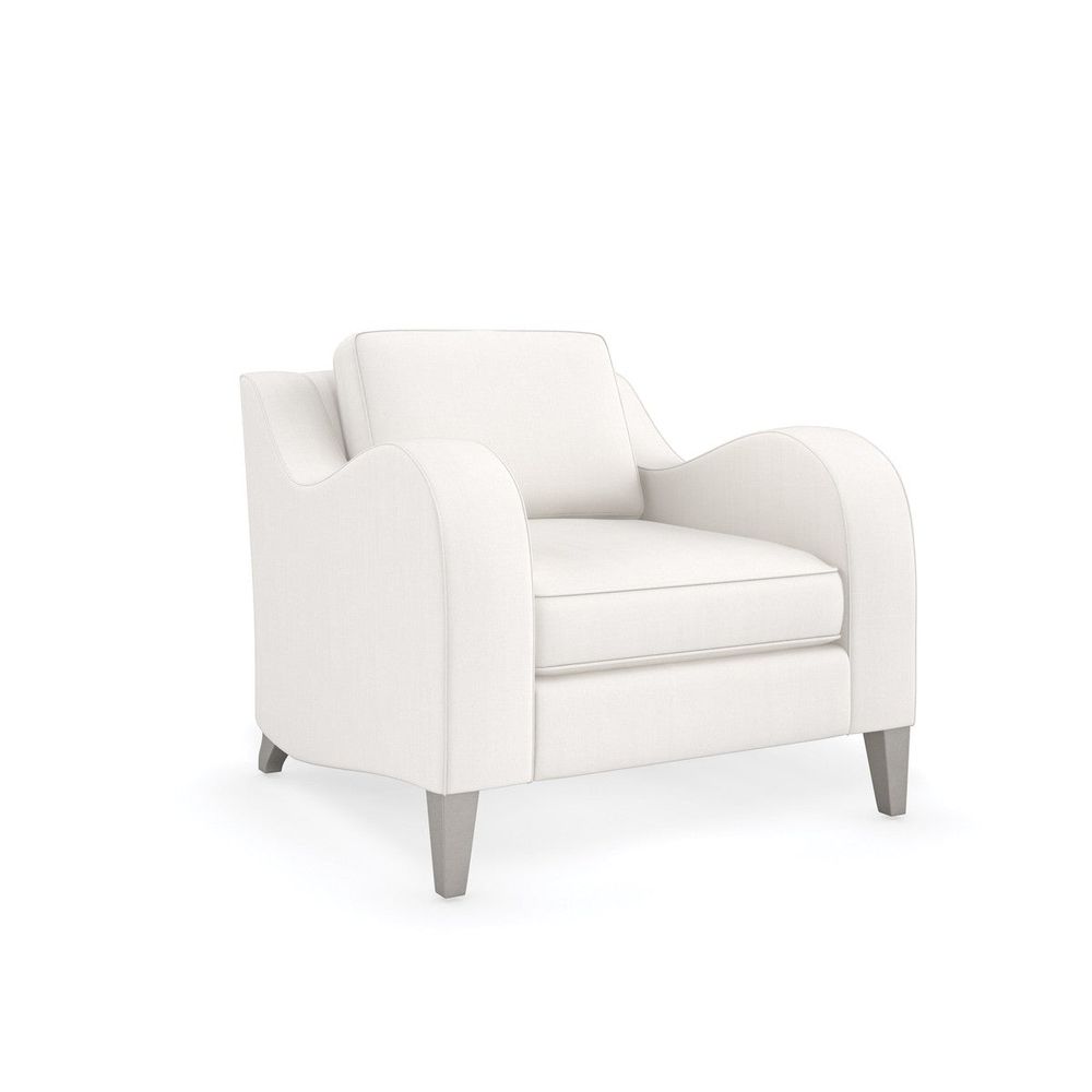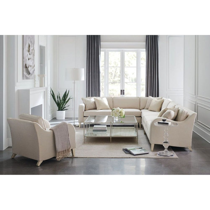This shapely chair adds a note of effortless glamour in a cream performance basketweave with a subtle luster. Gently sloping arms lend a contemporary take on the classic English arm for a look that's fresh, yet familiar. Tapered legs in a Sparkling Argent finish add to its shimmer. Sofa and sectional also available.