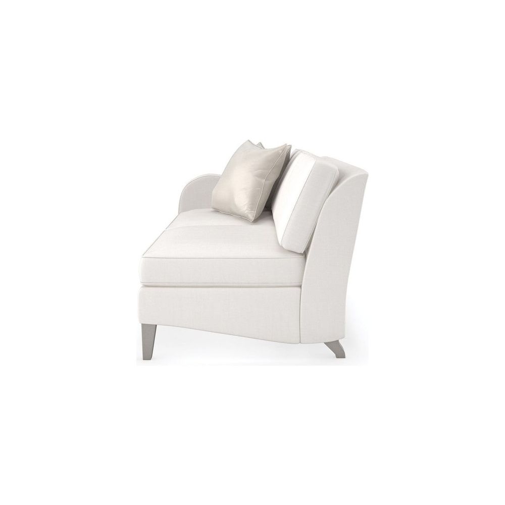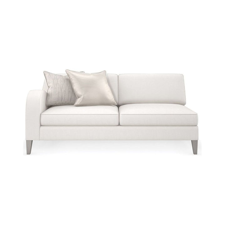 Inspire sparkling conversation and moments of reflection with this shapely sectional, upholstered in a cream performance basketweave with a subtle luster. A fresh, yet familiar addition to living room interiors, its gently sloping arms lend a contemporary take on the classic English arm, complemented by tapered legs in a Sparkling Argent finish. Accent pillows add shimmer and tactile appeal in a botanical leaf print and gold-toned satin. Sofa and chair also available.
