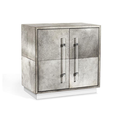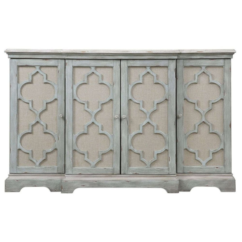 - Break Front Console In Weathered Sea Grey With Ivory Accents. Open-carved Doors Are Backed In Light Tan Linen, Enclosing Three Adjustable Shelves.