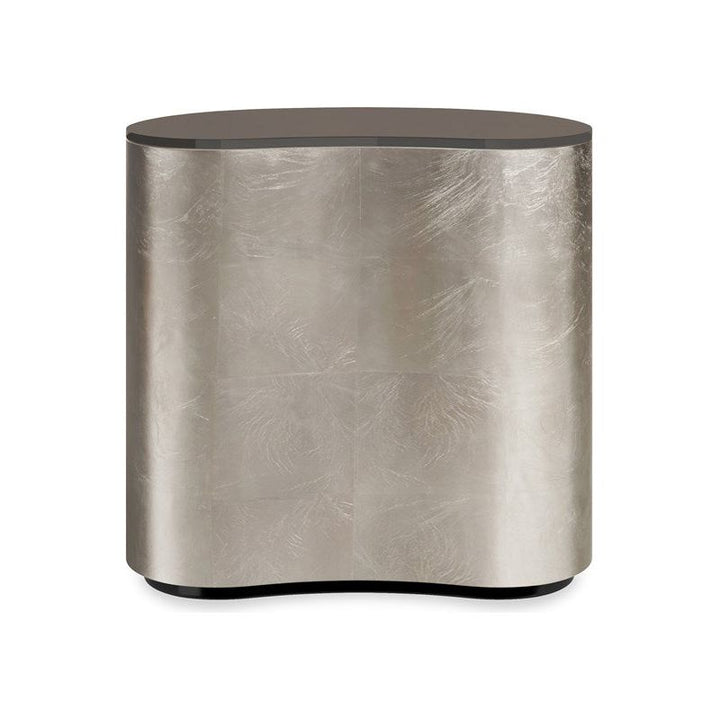 The Amalie kidney table is the smaller kissing cousin to the Adele Cocktail Table. Its modern shape is accentuated with a wide, smooth-surfaced case finished in Deep Bronze metal with a Brushed Deep Bronze metal top. The plinth is Almost Black with hidden casters for easy moving.