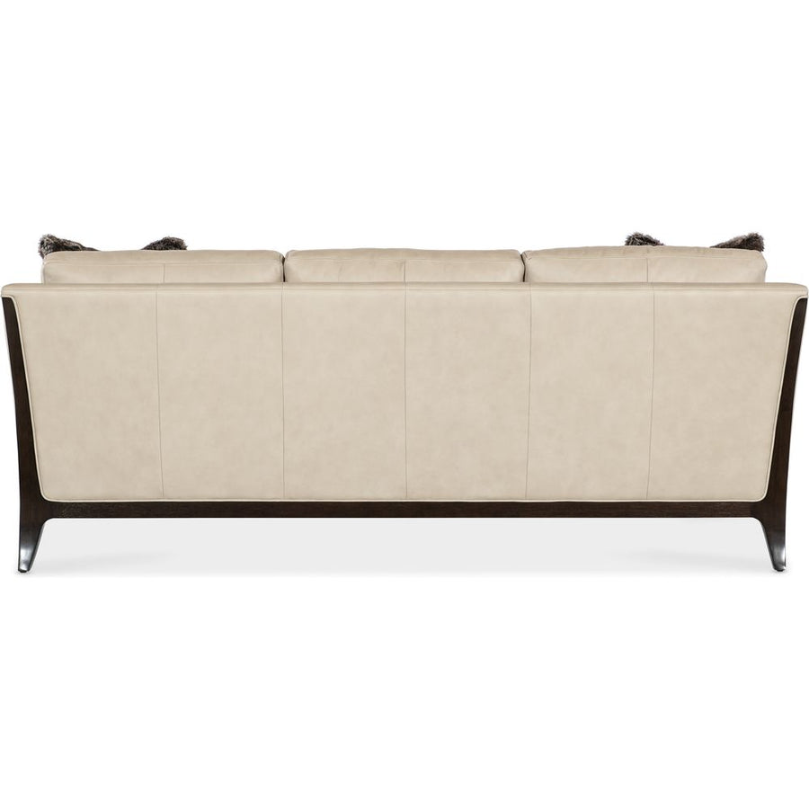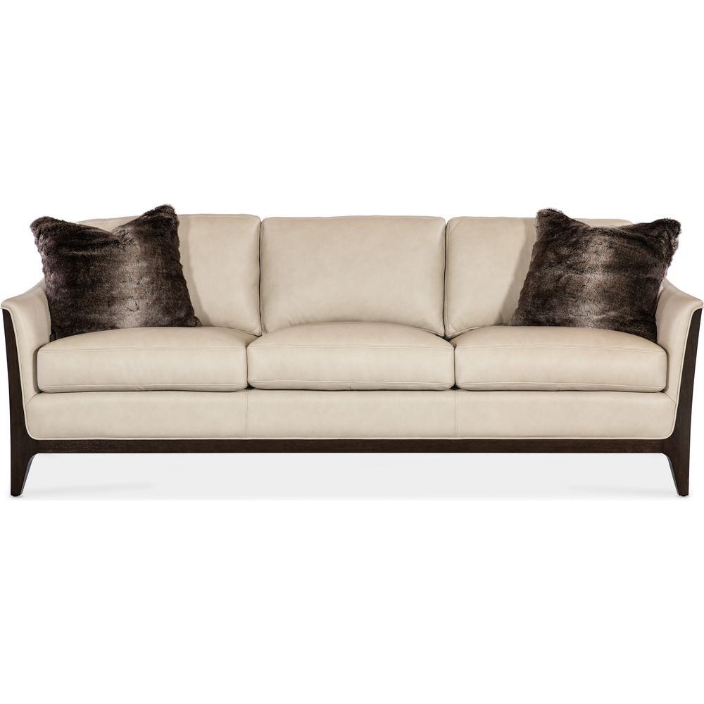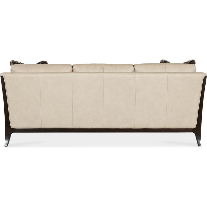 Description: The epitome of mid-century elegance with an updated design, the Sophia Sofa has flared wood legs and frame finished in the deep translucent tone of Caviar on rich Cathedral Cherry Veneers. Sophia is upholstered in the luxurious Aline Stonewash semi-aniline leather with topstitch and welt trim, complemented by two 19-inch fluffy accent pillows in the Full Moon Timber fabric.