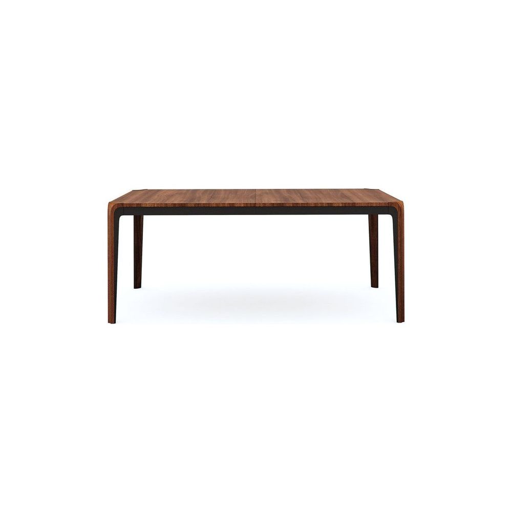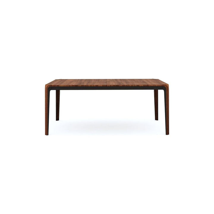 There's always room for more with this extension dining table, evoking a balance between refined simplicity and modern functionality. Highlighting the intricate wood grain, the tabletop is finished in Rich Walnut with mitered edges in Dark Chocolate. Tapered legs, also trimmed in Dark Chocolate, appear to flow from the tabletop like a waterfall. Comfortably seats 8 without leaves, and seats 14 when fully expanded with three leaves.