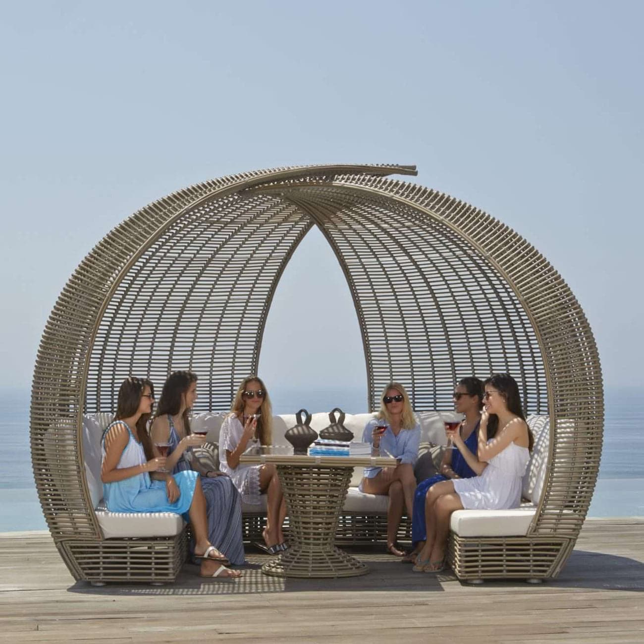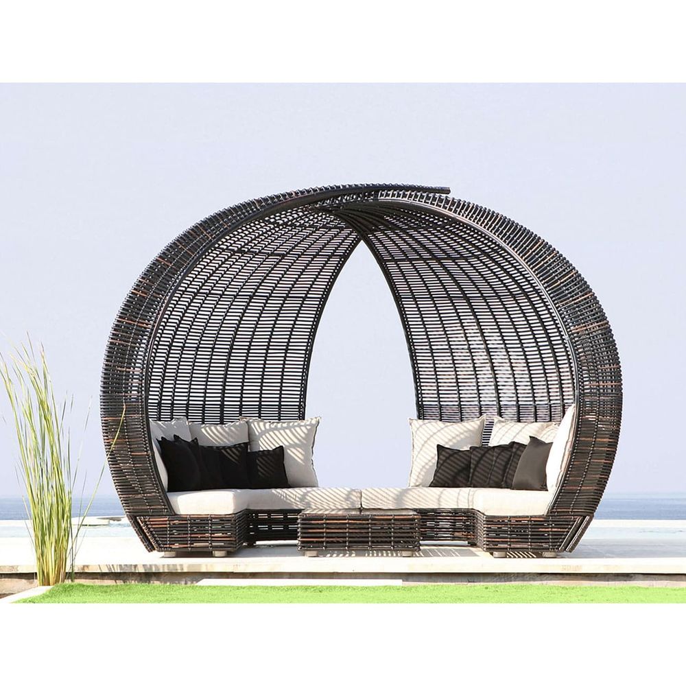 The Sparta Lounge is definitely a stand out piece and will surely draw much attention to any pool party or casual gathering. Suited to accommodate eight to ten individuals comfortably, the Sparta is furnished with back cushions and throw pillows in Sunbrella fabric. Its dome shaped structure is made up of the Viro open weave fiber over aluminum frame, available in black mushroom and kubu mushroom.