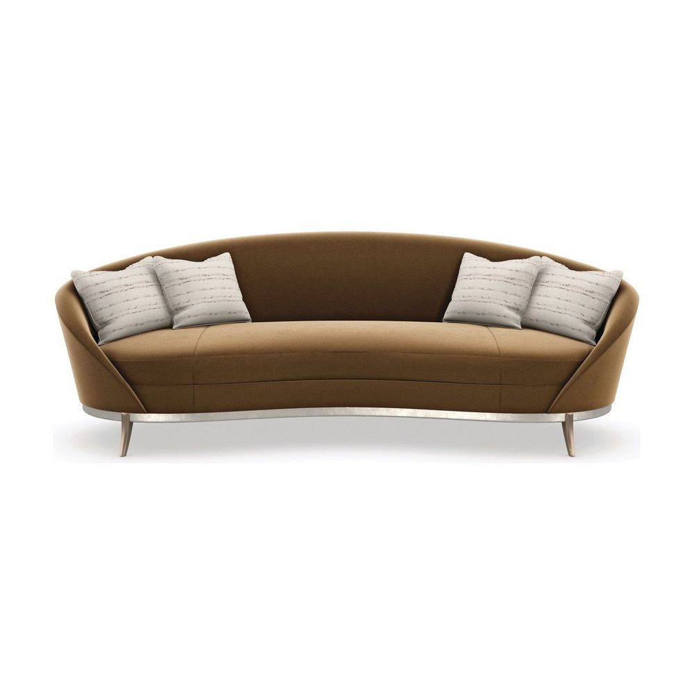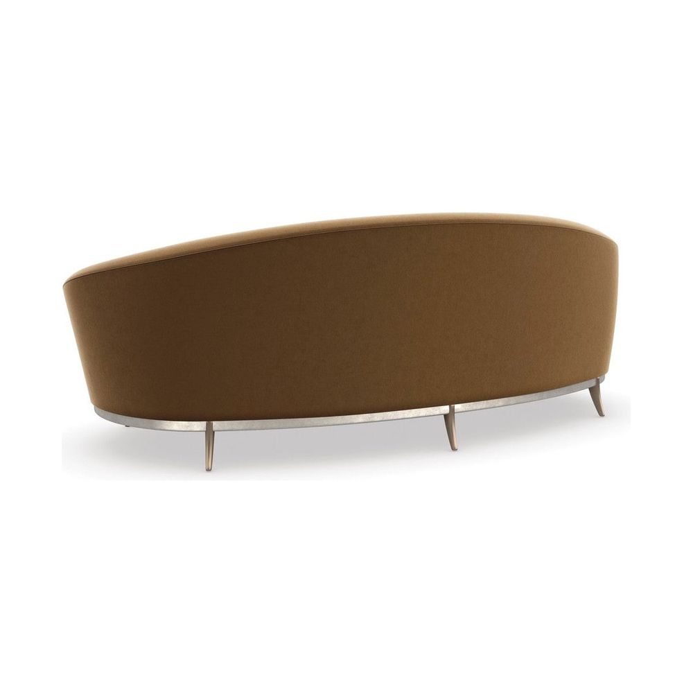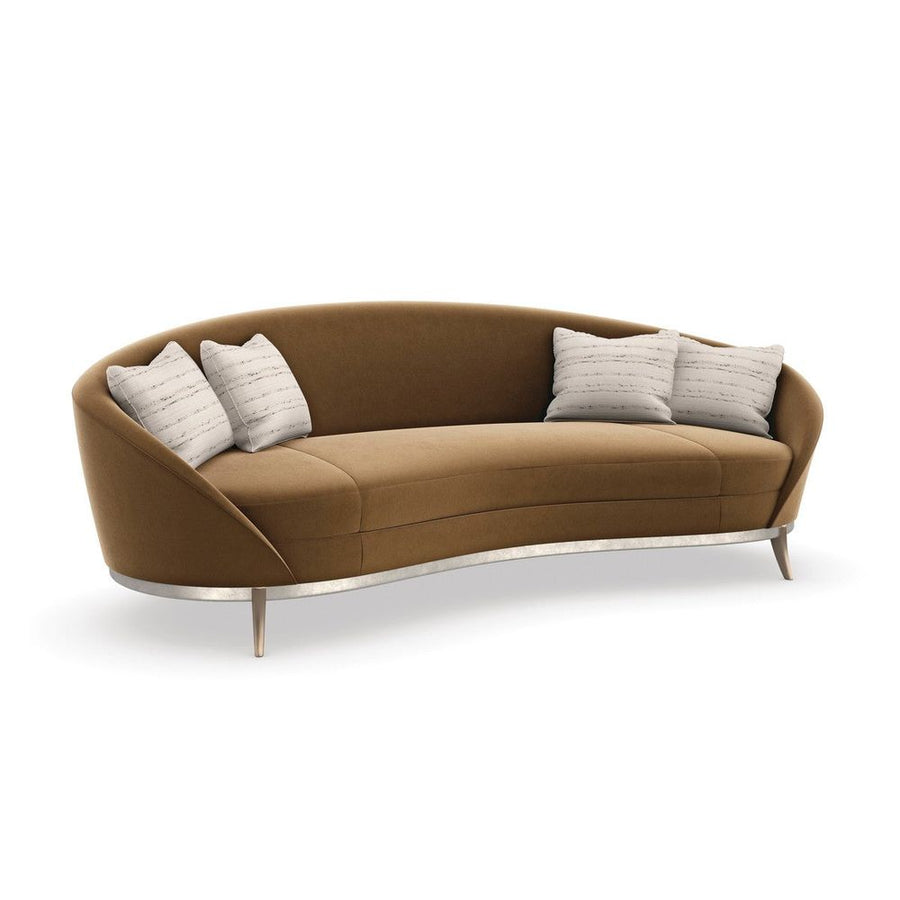 With an iconic kidney shape, this sumptuous sofa offers enveloping comfort in a warm caramel-colored velvet. Its gracefully flowing form features a smooth back and bowed bench seat, with French seams for a distinctive accent. Bronze sabre-style legs elevate its curved wood base, finished in Duty Silver for a touch of luxe. Toss pillows in a shimmering cut velvet add a painterly stripe and pop of contrast.