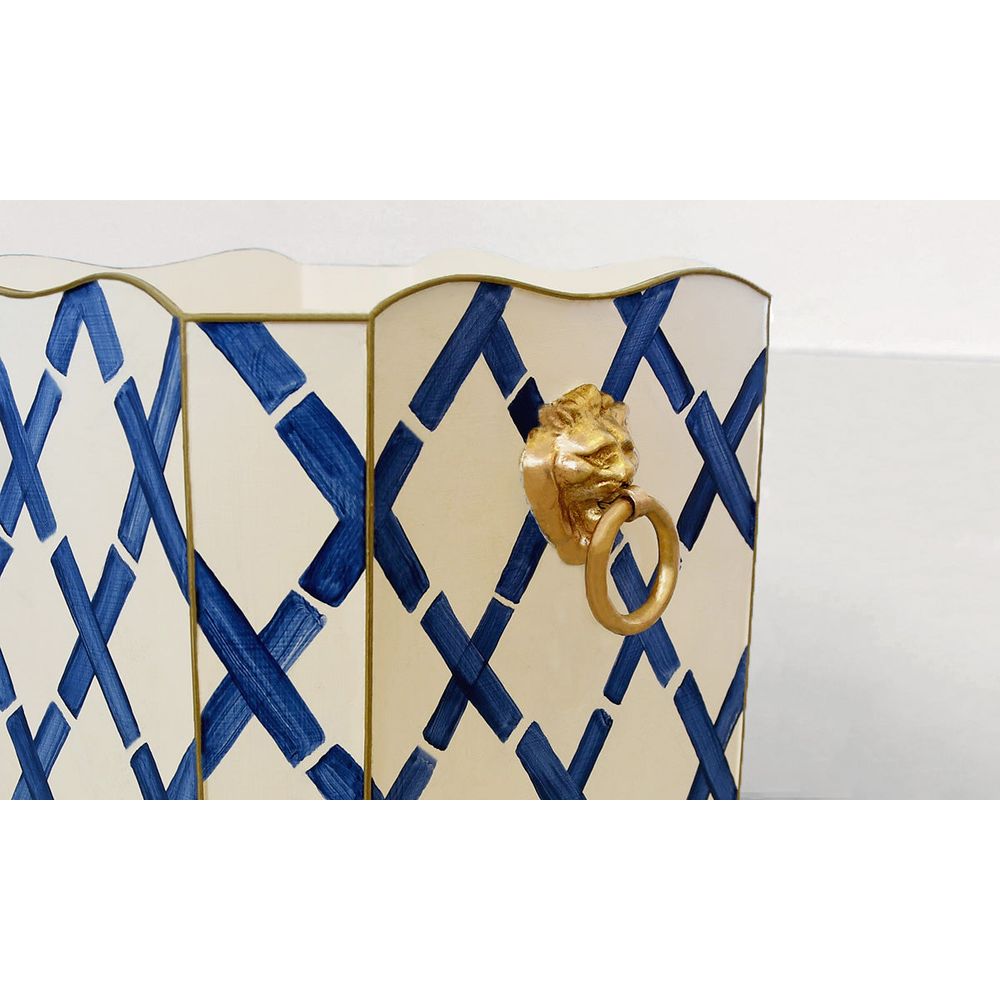 Description: SQUARE WASTEBASKET WITH RAISED ENDS AND LION HANDLES
