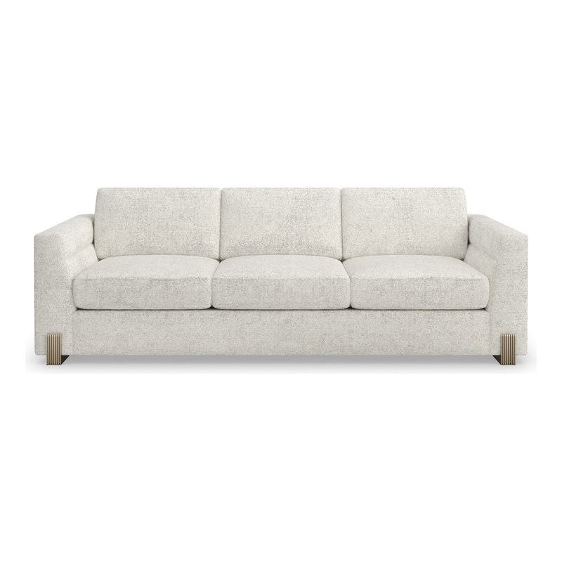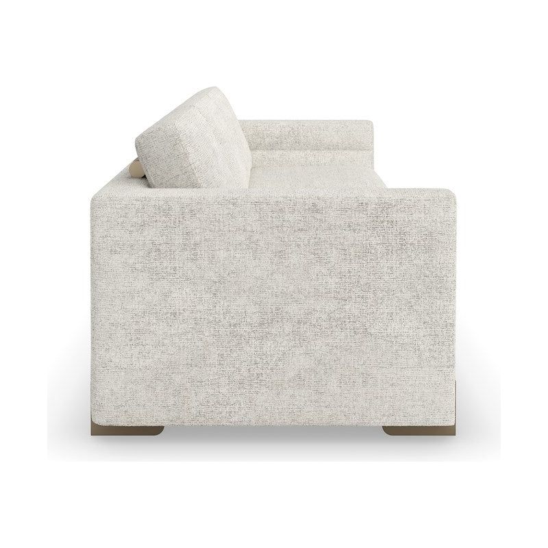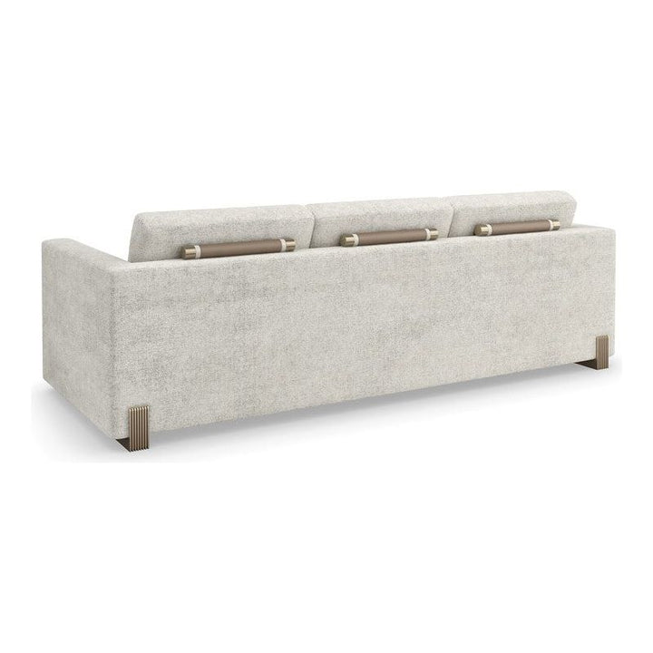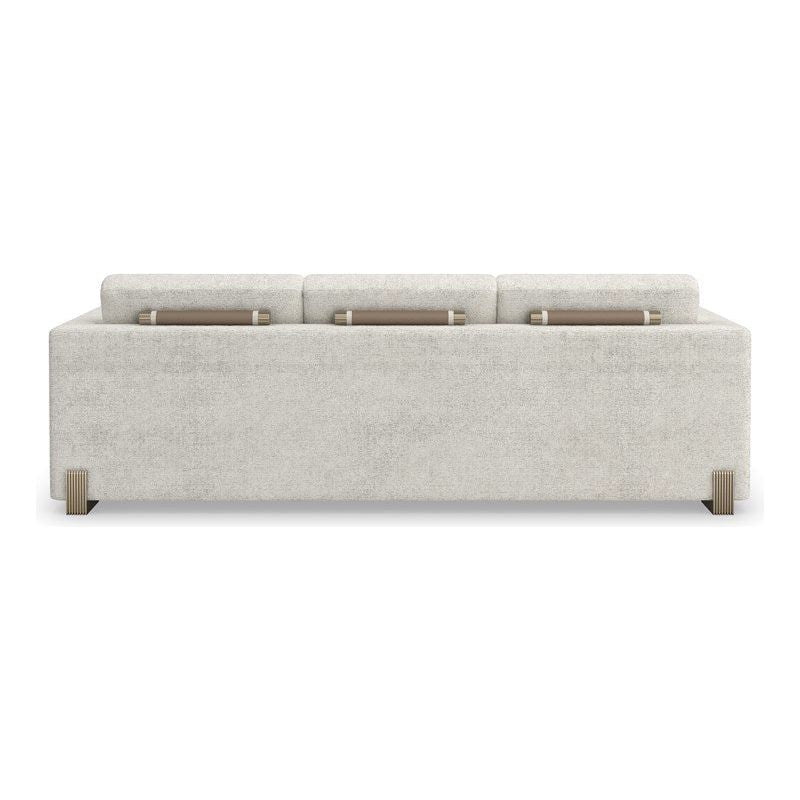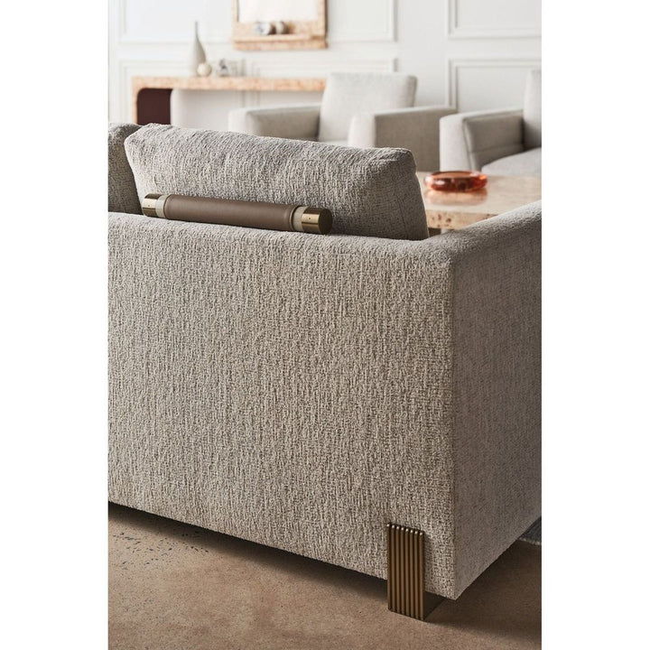 A refined mix of texture and material, the Counter Balance sofa is soft-lined yet sophisticated in an oatmeal melange woven fabric with subtle rust threading. Channel-tufted arms with a slightly angled taper comfortably enclose its loose seat back cushions, propped by a faux-leather-wrapped, counter balance capped in Champagne Gold. Reeded cast legs add tactile appeal and a note of distinction.
