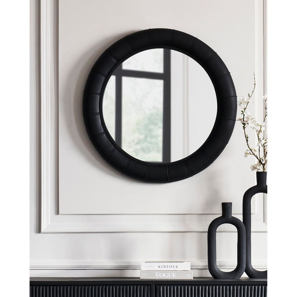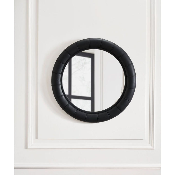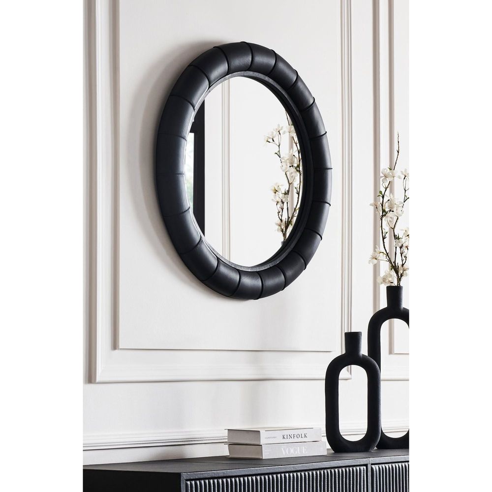 Description of construction: Genuine leather wall mirror. Structure handcrafted of engineered hardwood.