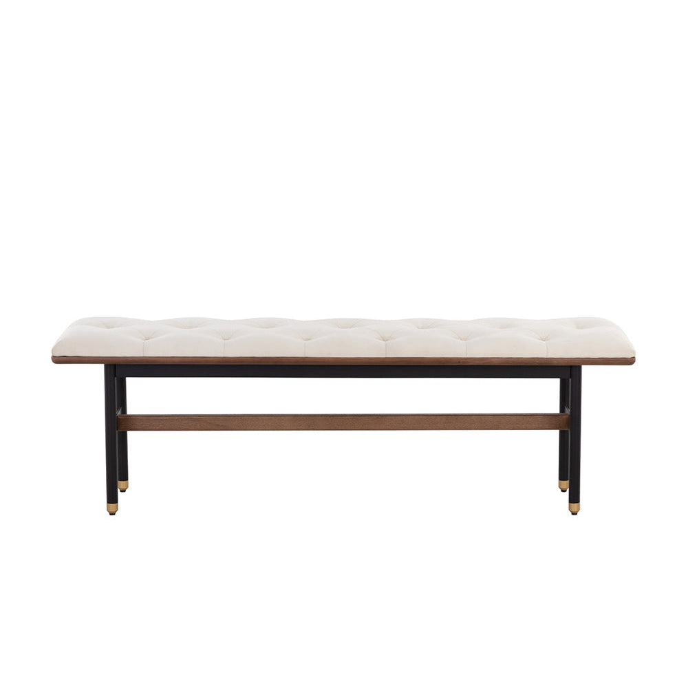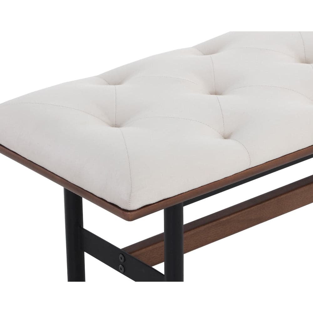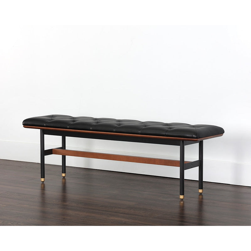 Sophisticated and timeless, this mid-century modern bench includes beautiful button tufting on the seat. Stocked in black faux leather and paired with a black steel base. Features an accenting solid walnut timber frame and beam on the base. Brass metal caps complete the look. Also available in vienna cream fabric. Handle With Care: This design has been crafted with faux leather. Faux leather is manufactured to reflect the natural characteristics of leather; as such, colour variations, markings, wrinkles, grooves, and light scratches are appreciated characteristics. No two pieces will be alike. Visit our Product Care page for more information on how to ensure the lasting beauty of this piece.