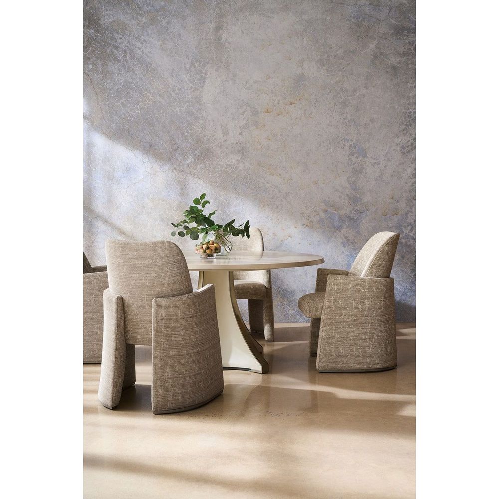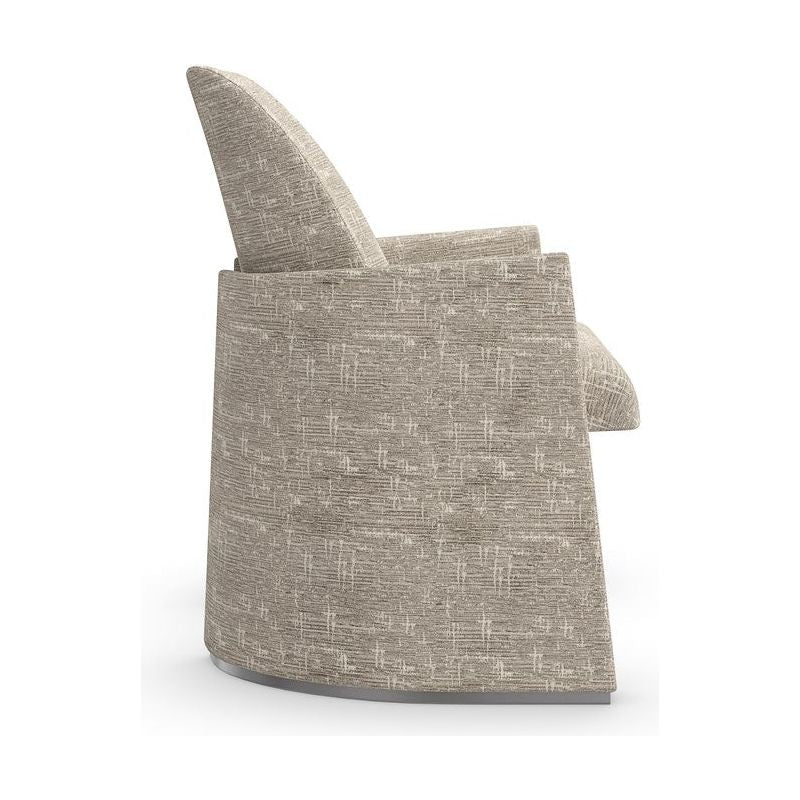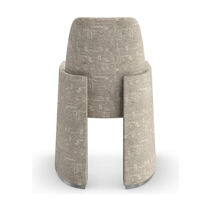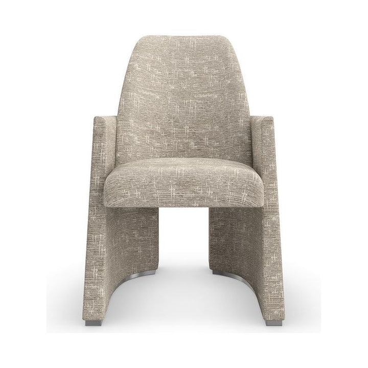 The perfect balance of straight lines and curves, this fully upholstered dining chair infuses interiors with a sense of effortless elegance and comfort. Aptly dressed in a tactile, silk-like fabric, its rounded back and cantilevered seat appear to float between two gently arcing side arms. A Brushed Stainless-painted base lends a distinctive finishing touch and adds to its floating appearance.