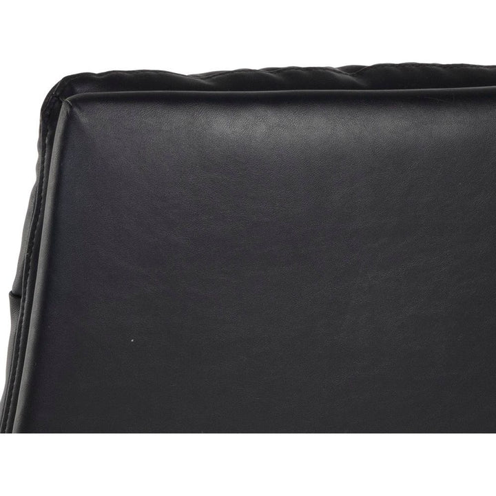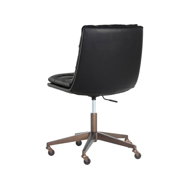 Description: Work in maximum comfort with this mid-century modern office chair that features a generously-padded backrest. Stocked in bravo black faux leather. Completed with an antique brass steel base with added castors for mobility. Handle With Care: This design has been crafted with faux leather. Faux leather is manufactured to reflect the natural characteristics of leather; as such, colour variations, markings wrinkles, grooves, and light scratches are appreciated characteristics. No two pieces will be alike. Visit our Product Care page for more information on how to ensure the lasting beauty of this piece.
