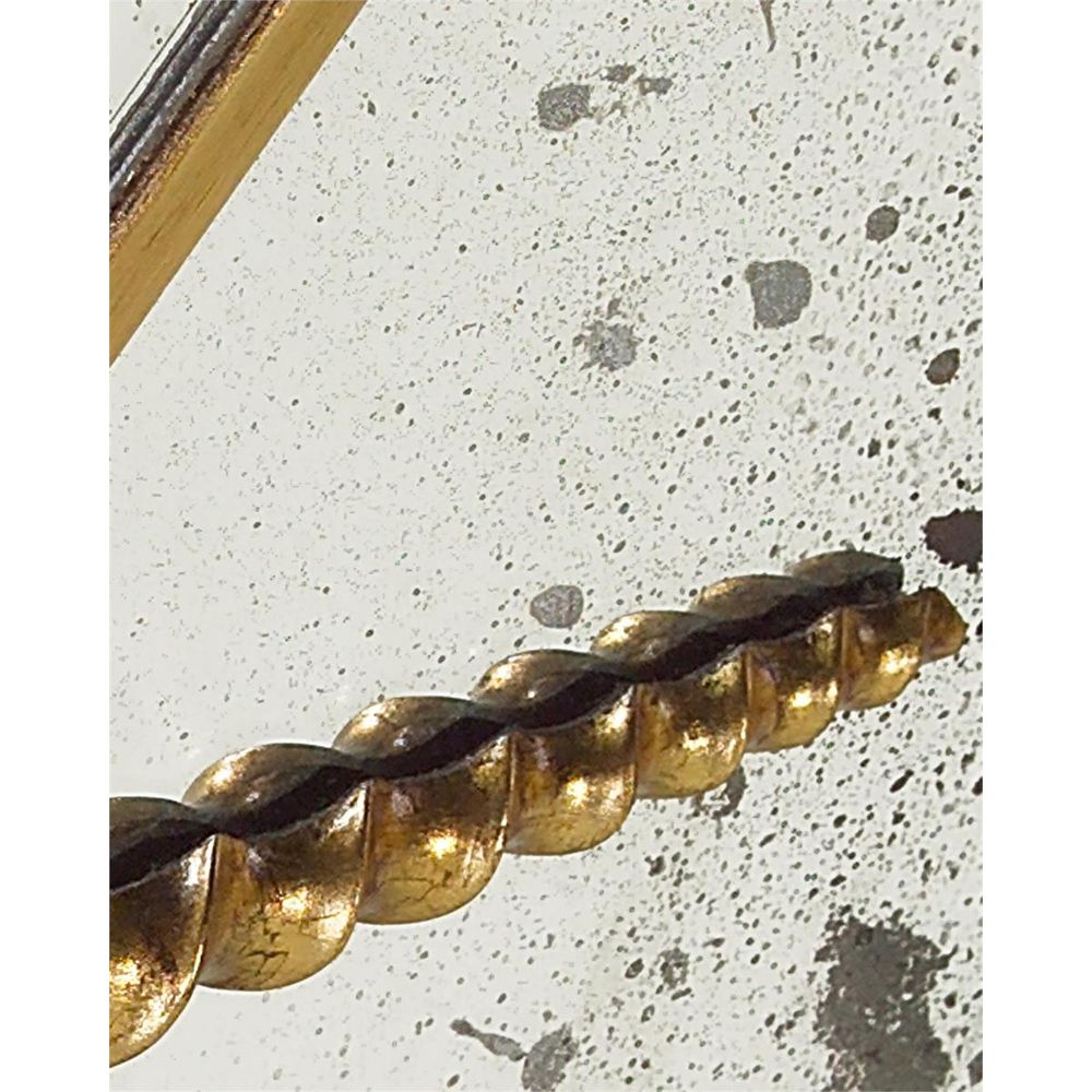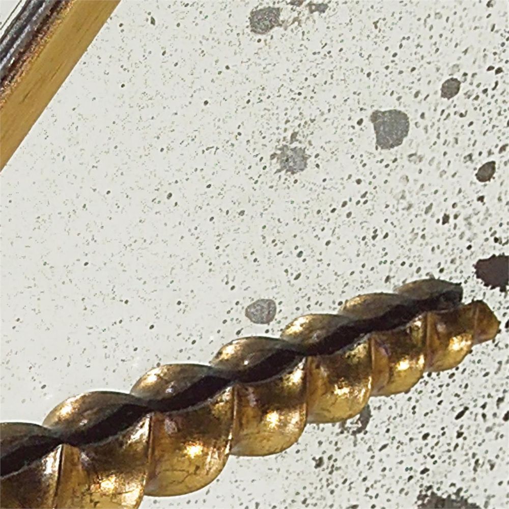 Below the black glass top, the doors and steel base frame are finished in Old Gold, while the ends are black lacquer. The doors have a central, decorative, carved spiral twist feature applied over foxed mirror panes. The spiral twist is echoed in the steel base and handles. The left side of the cabinet has an X-frame.
