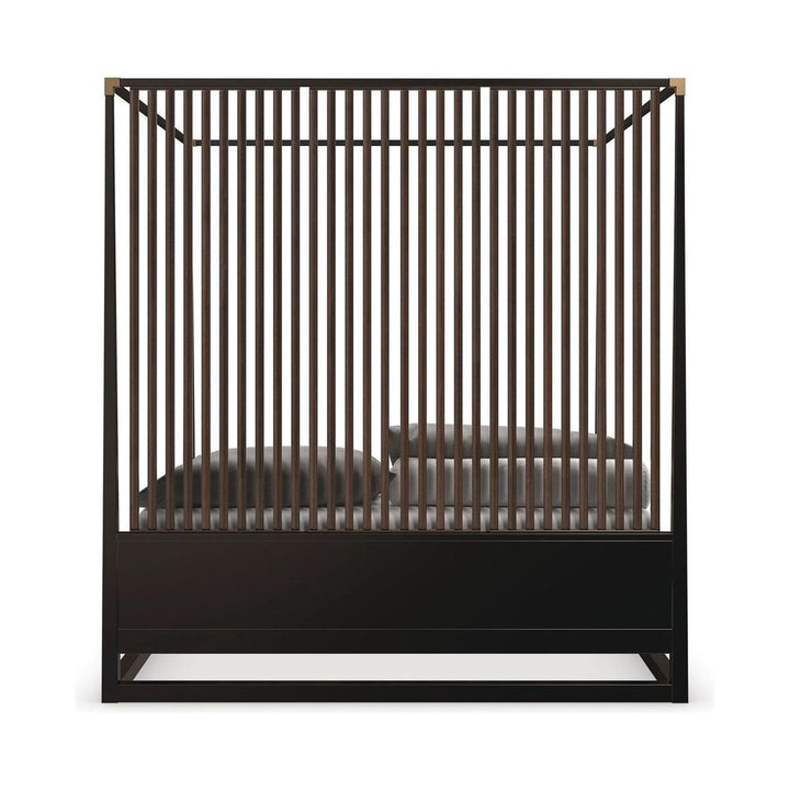 Cascading lines lend a bold backdrop to this updated take on the classic canopy bed. Architecturally-inspired design features Rich Walnut vertical slats, warmly contrasted by a Dark Chocolate canopy and posts accented with Champagne Gold brackets. Adding to its allure, the bed platform appears to float, for an elevated, modern look