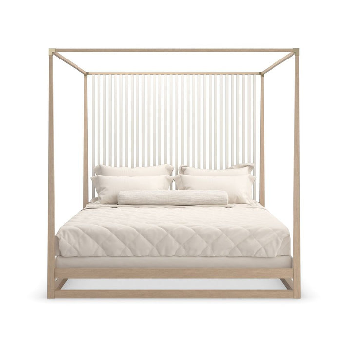 An updated take on the classic canopy bed, Pinstripe Light reimagines a beloved style in a fresh material mix. With a canopy and posts framed in Sundrenched quarter sawn oak, its architectural design is emphasized by cascading vertical slats in a creamy Almond Milk finish. Metal post brackets in Champagne Gold add a jewelry-like finishing touch.