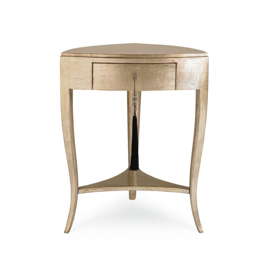This little accent table is dressed to the nines in our signature Pompeii gold metallic finish - beloved by our interior designer customers for its beautiful blending of silver leaf and a soft wash of metallic gold. It's like jewelry for your home - a definitive design element for those settings when only ultra glam will do. The petite drawer is accessorized with a black tasseled key. So very, very chic, we think.