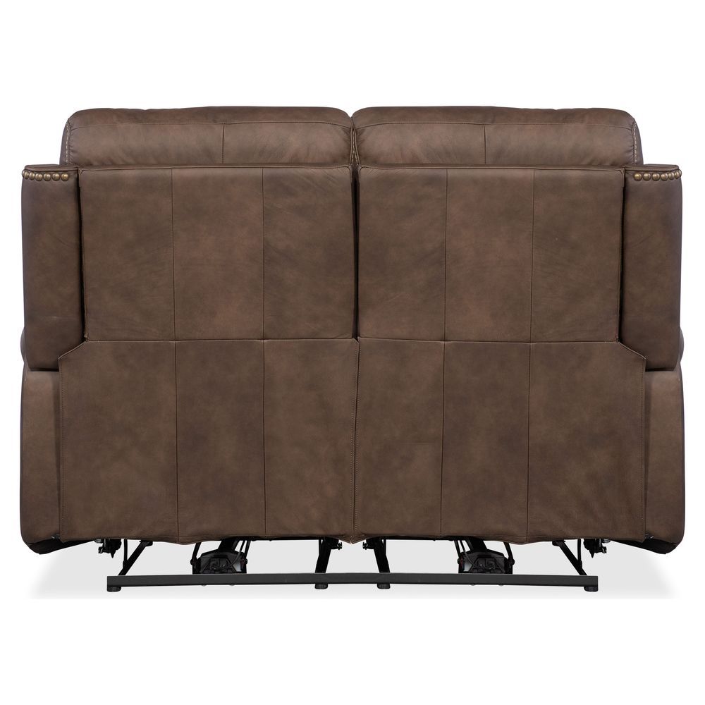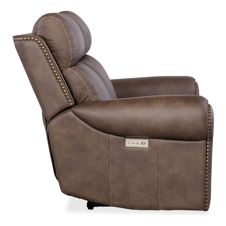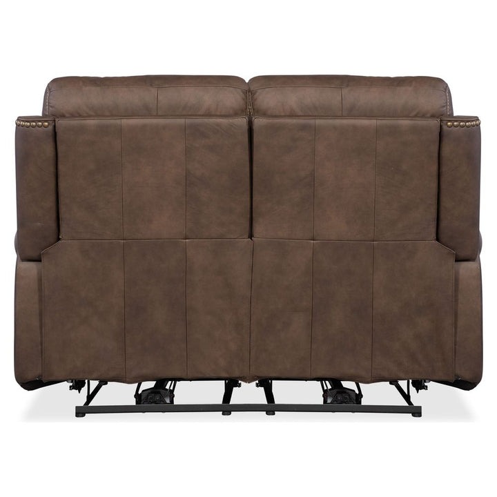Description: Plush and oh-so-inviting, the Summit Power Loveseat with power headrest and lumbar support is the ultimate in comfort. Featuring plush seat cushions and a bustle-style back, rolled arms and nailhead trim, it has a USB port and pop-out arm panel with a hidden metal cupholder. The two ends recline all the way back into the "zero-gravity" position, to give you a sensation of weightlessness with no pressure points. The loveseat is upholstered in the semi-aniline top-train Kalahari Bark leather.