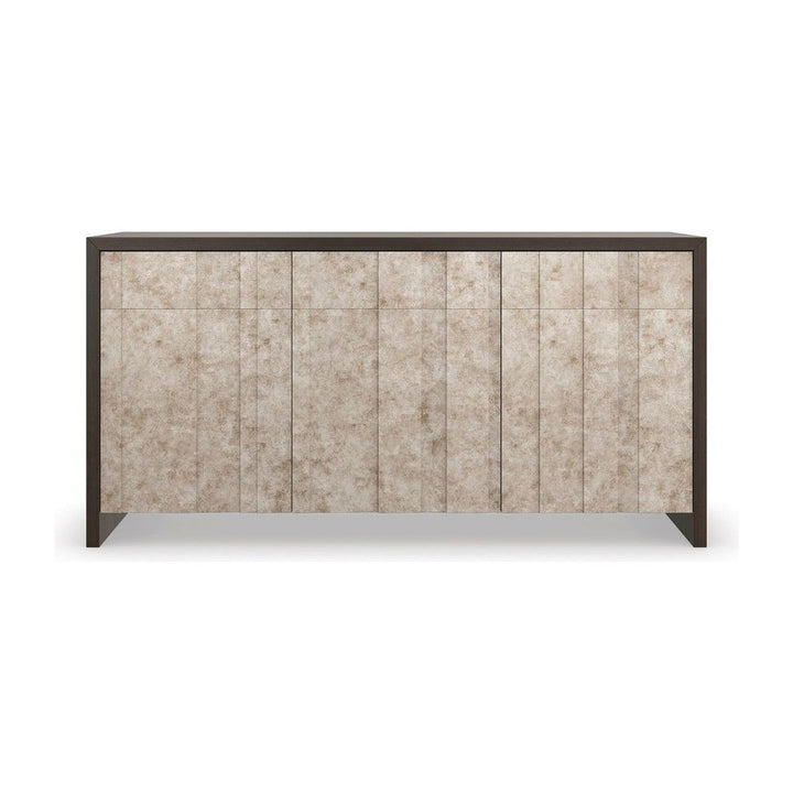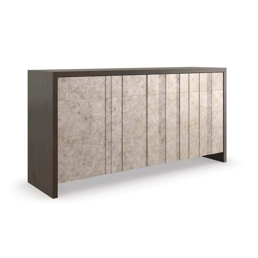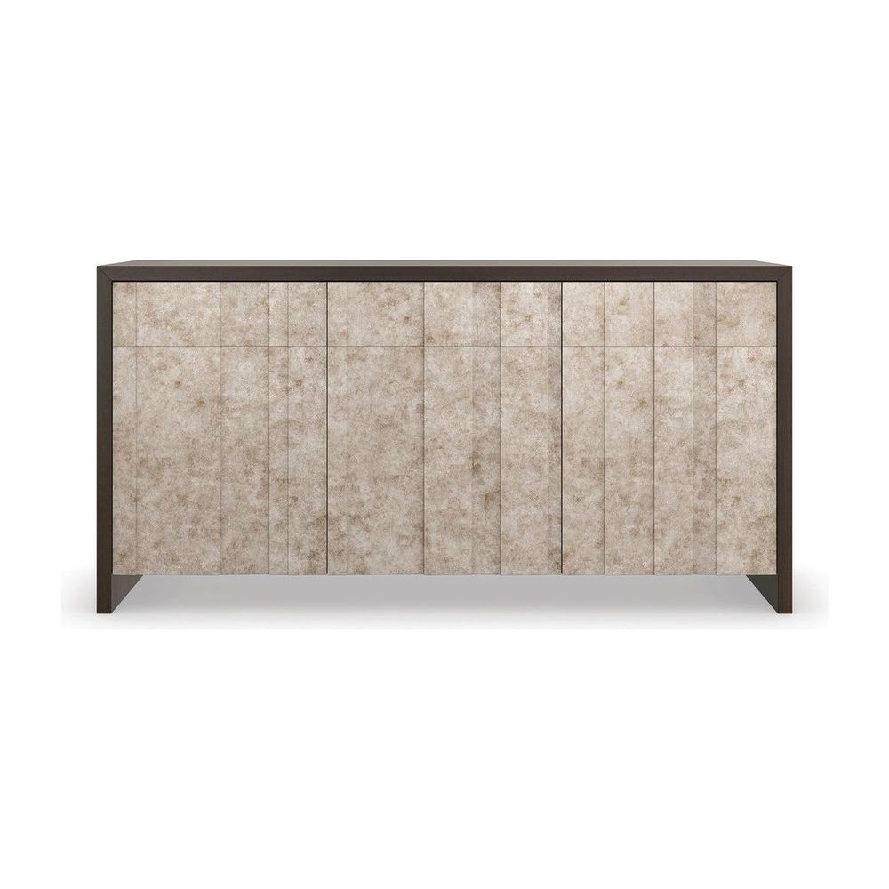 With a warm shimmer reminiscent of mica minerals, this multifaceted sideboard introduces an interplay of light and shadow. Applied by hand, Intricately pieced silverleaf wraps touch-latch doors and drawers of varying dimensions for added depth and reflection. Its Dark Chocolate-painted interior features adjustable shelves behind each door for streamlined storage, intentionally styled to make a statement in any interior.