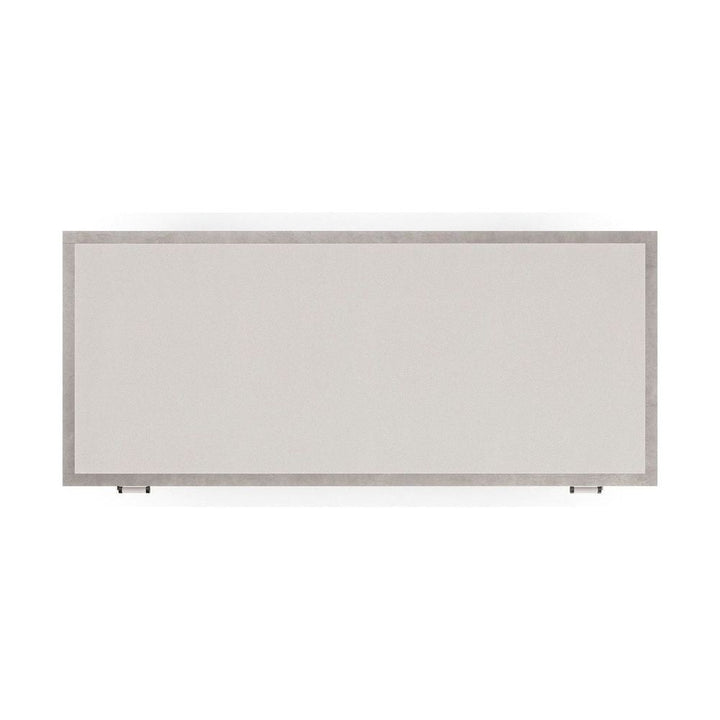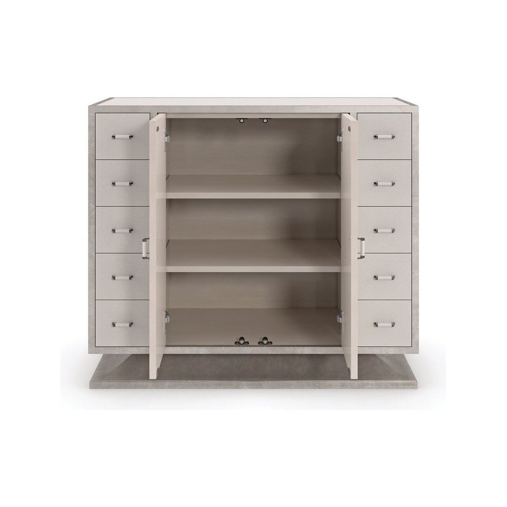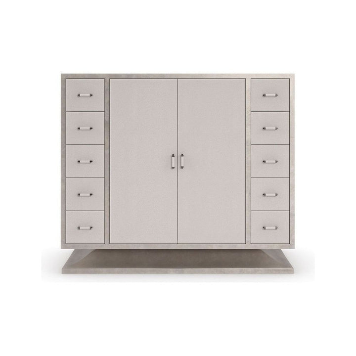 For curiosities and keepsakes, this Art Deco-inspired cabinet features ten petite drawers and ample storage behind two soft-close doors with European hinges. Wrapped in faux shagreen, it introduces a classic, collected-over-time aesthetic, punctuated by a wood base and trim in a smoky Charcoal finish. A Matte Pearl-painted interior and metal pulls, also wrapped in faux shagreen, add an element of distinction to this casually luxe storage piece.