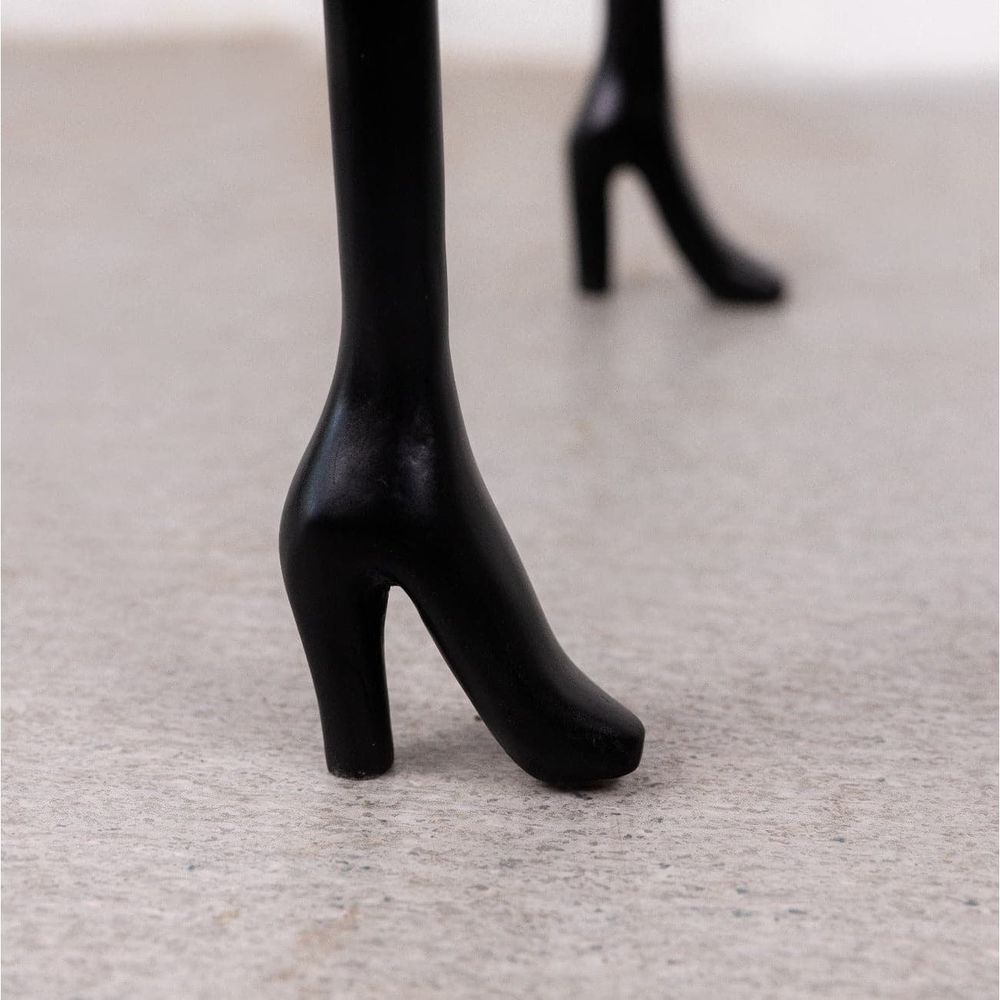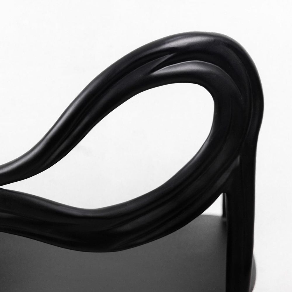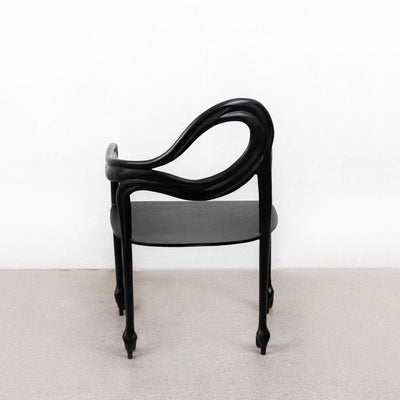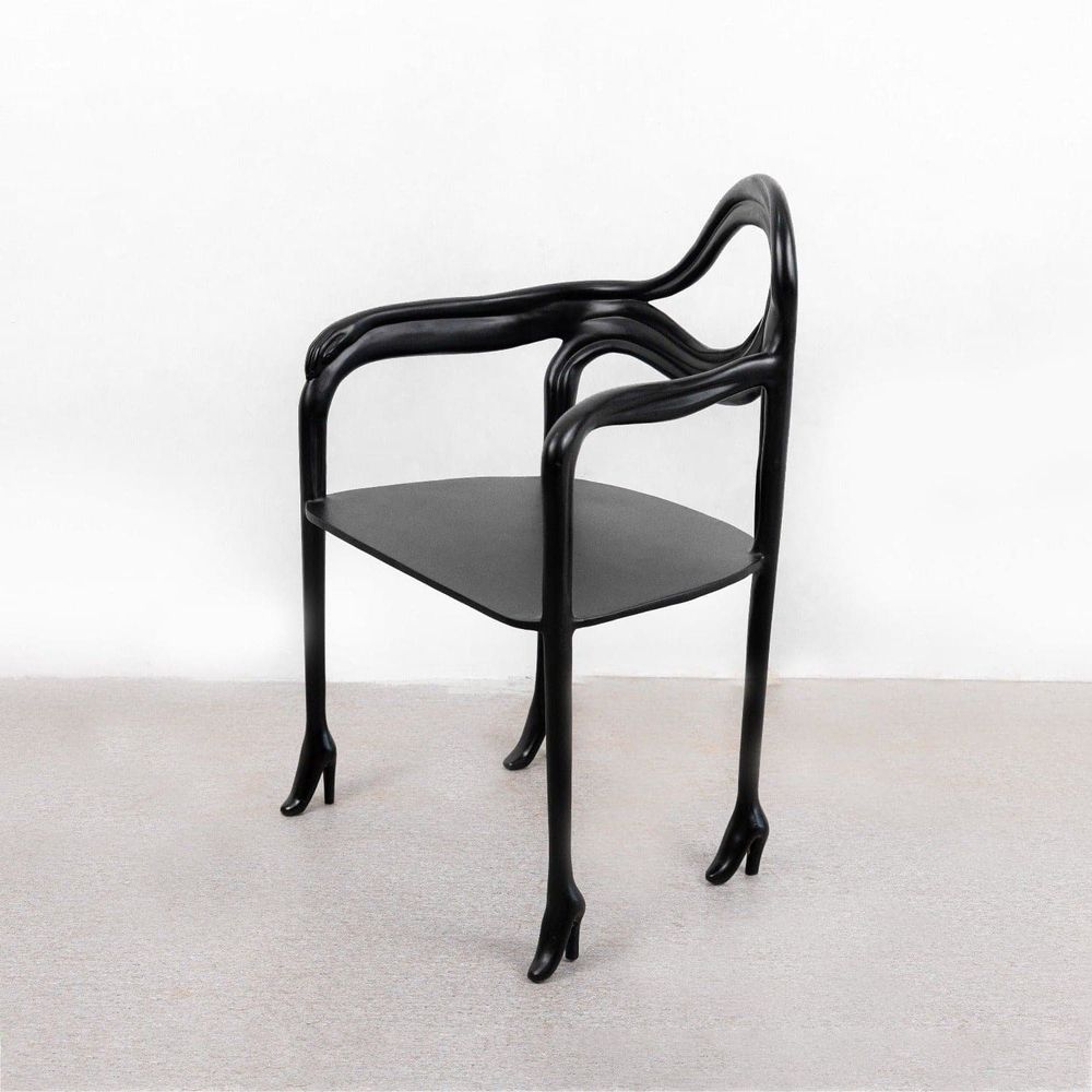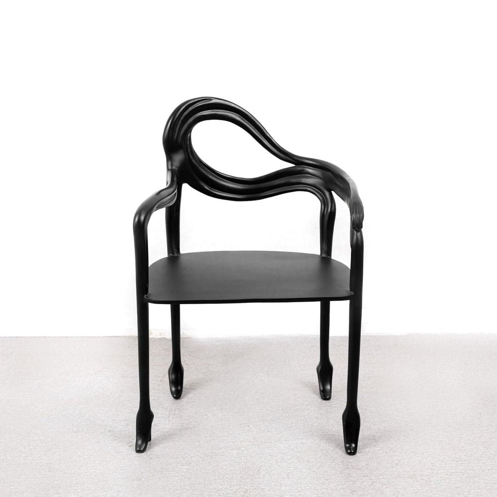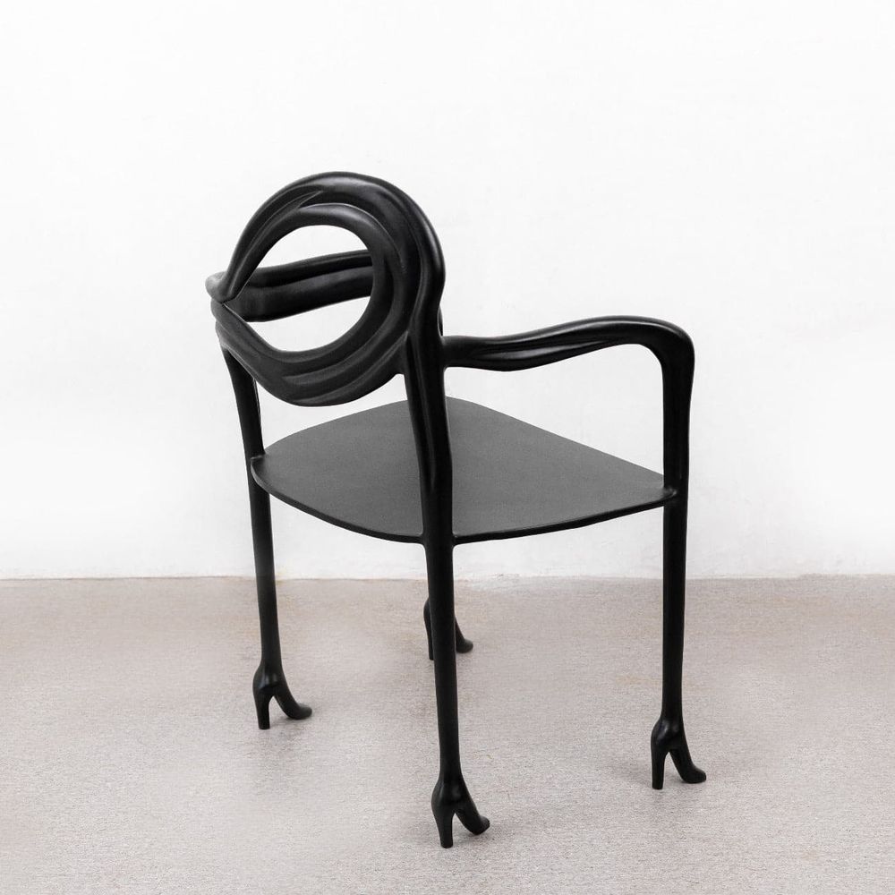 This eye-catching arm chairfeatures a stiletto thin solid cast aluminum frame that curves and loops around to create a functional frame that doubles as a sculpture. The surrealist style culminates with little whimsical feet at the base of each leg that look like little stiletto shoes, and a little hand on the armrest. Add some sophisticated style and character to your space with a truly unique chair that doubles as a sculpture.