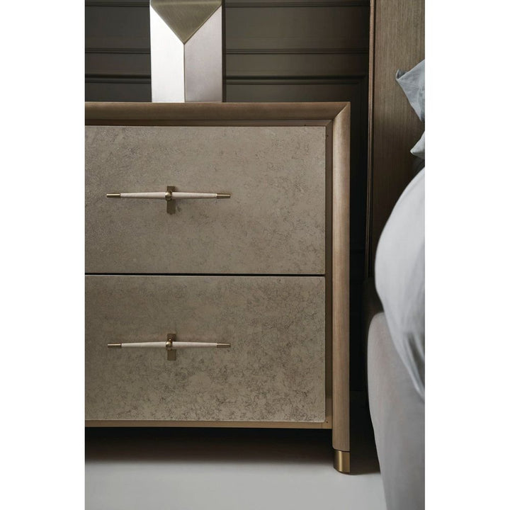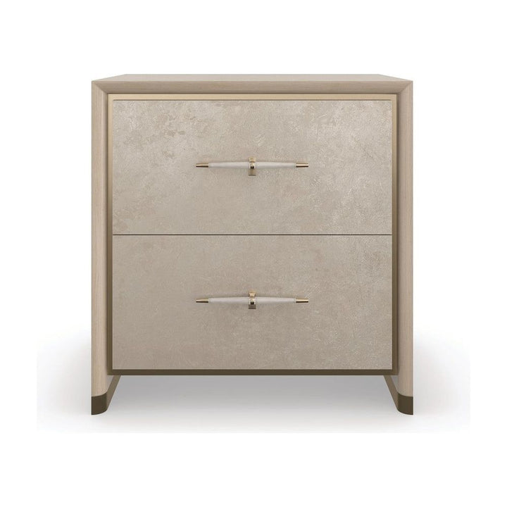 A captivating bedside companion, the Hang Up small nightstand melds the natural beauty of wood with the allure of metal. Features soft-close drawers finished in a broken leaf metallic that recalls the shimmer of a frost-covered, candle lit window. Brushed Gold accents and tapered drawer pulls wrapped in hand-stitched, faux leather add warmth and a luxe finishing touch. Style in pairs, or with our Hang Up large nightstand for added interest and dimension.