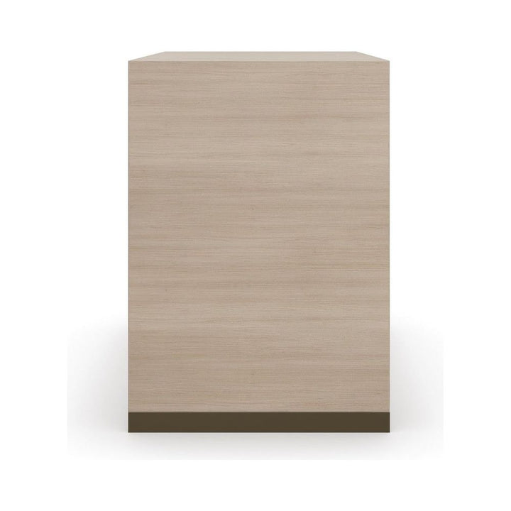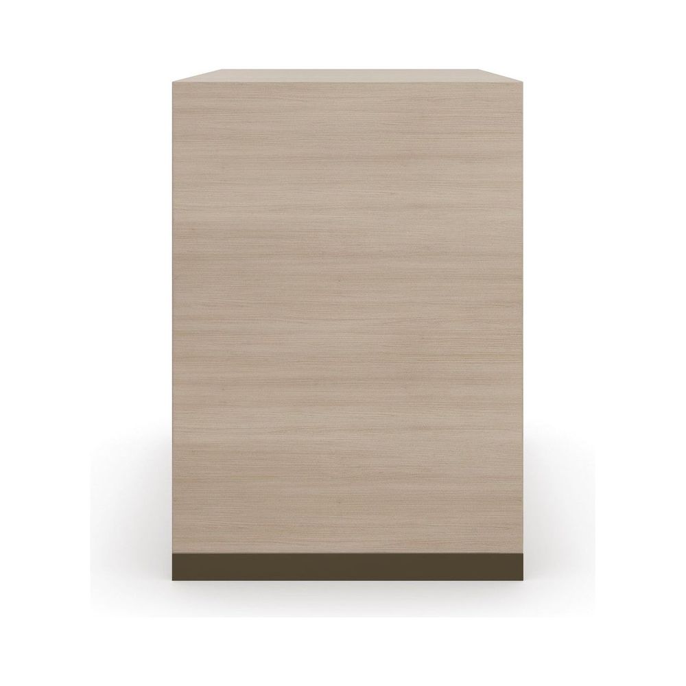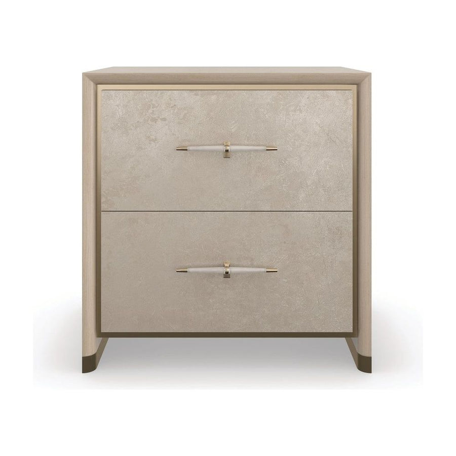 Features: Case frame finished in Dry Martini.Two drawers with fronts finished in Winter Frost with soft close undermount guides. Bottom of end panels have a metal cap in Brushed Gold. Drawer interior in Linen. Wire management access in back. Hand-stitched vinyl-wrapped hardware.