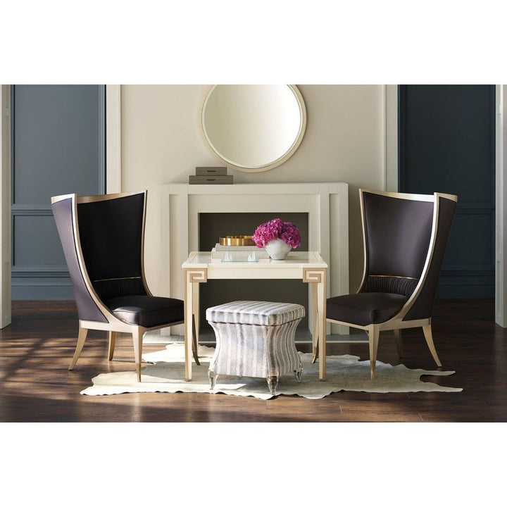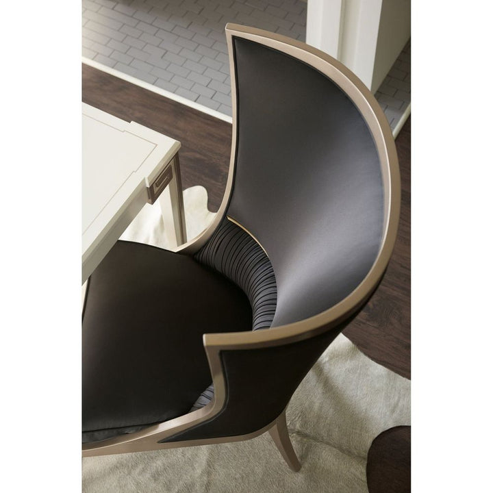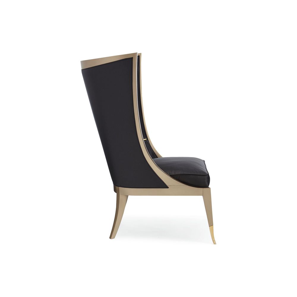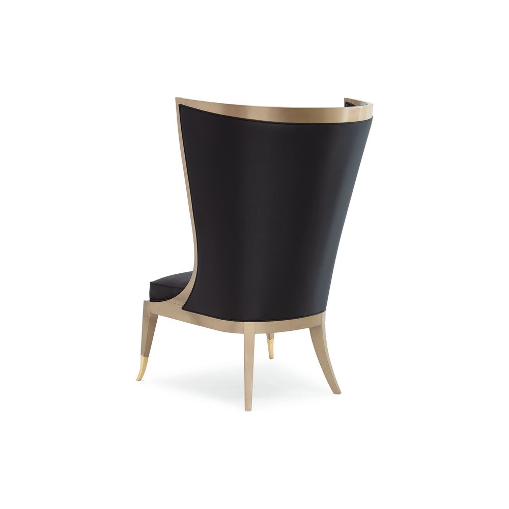 Attention-getting by nature, this exceptional chair has considerable presence. Its tall winged back design is expertly upholstered in a luxurious chocolate plum satin and trimmed in a silhouetted wood frame wearing a Golden Shimmer finish. Of particular note is the extraordinary tailored finger-pleat detail along its inside lumbar. Expertly trimmed with a metal bar finished in Champagne Gold, this elegant detail matches the metal ferrules on its front feet. Inspired by the glamour of the Hollywood Regency era, this signature chair is simply magical, masterfully fresh, and all refined.