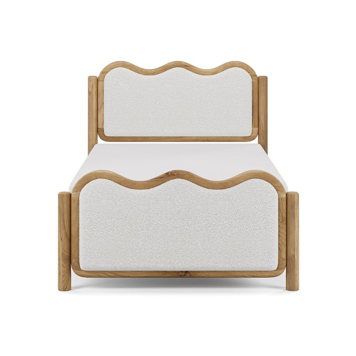 Description: Dynamic in form, our Swirl bed will add a touch of whimsy to your bedroom. A solid, FSC-certified Oak surround frames a soft, upholstered boucle head and footboard with a soft, wavy edge.