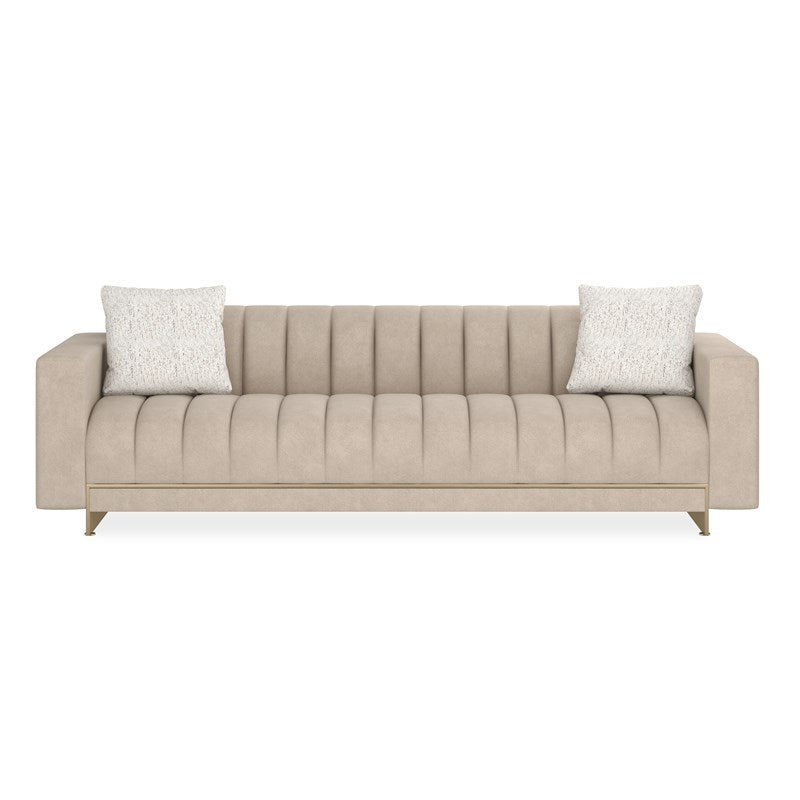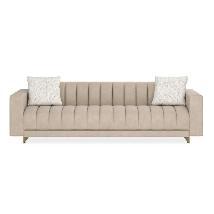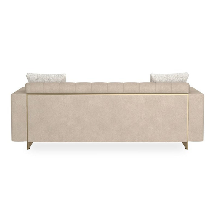 The Well-Balanced Sofa was inspired by Italian design and offers beautifully tailored channel tufting in a luxurious basketweave fabric in a shimmering Moonstone hue. This stylish vogue detailing and cosmopolitan silhouette makes this sofa the perfect focal point to build a spectacular room around in whichever chic city you're in across the globe. A tailored, thin gold detail is incorporated into the sofa frame. Its squared arms are the perfect height for resting or reading. Suspended off the ground by a continuous Whisper of Gold framework, this sofa appears to be lighter than air. This sofa's sophisticated lines look beautiful when floating in an interior.
