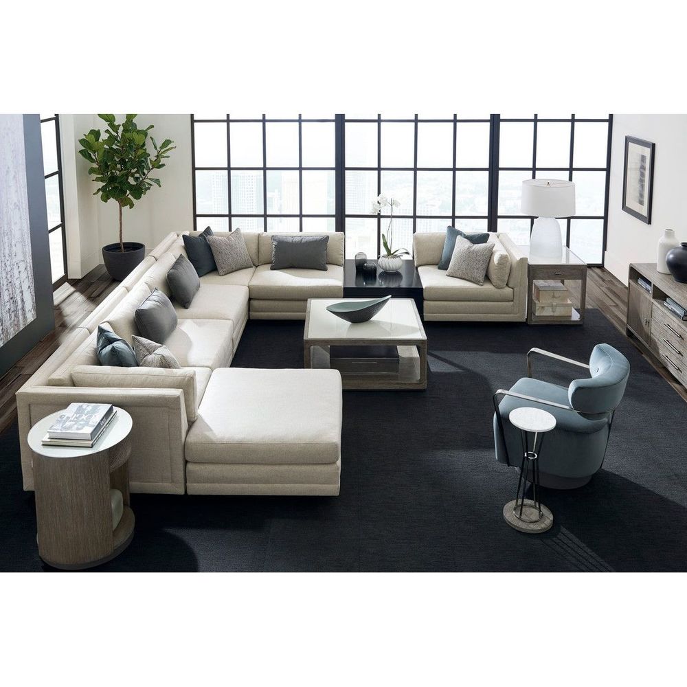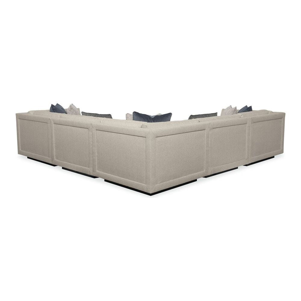 Casually elegant, this fully upholstered corner unit is designed to work with the armless chair to create any configuration you need for your living space. Its versatile design lets it work as a right-arm, left-arm or corner piece. Perfectly sized and deeply comfortable, it's tailored to perfection in a neutral, menswear-inspired look with a textured tweed pattern that's touchably soft. Contrasting accent pillows add additional style, fashioned in a deep gunmetal grey velvet and a contemporary styled black and white herringbone stitch. A cut-out boxing design around the outside back and a recessed wood plinth base in Simply Black complete this piece distinctive aesthetic style.