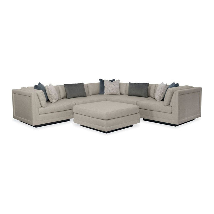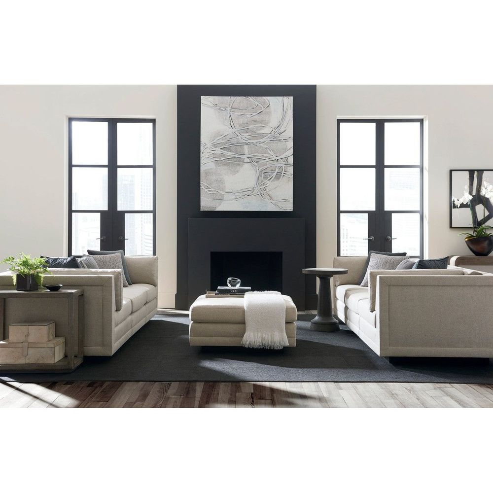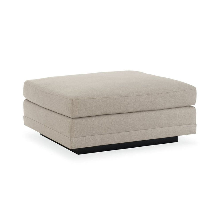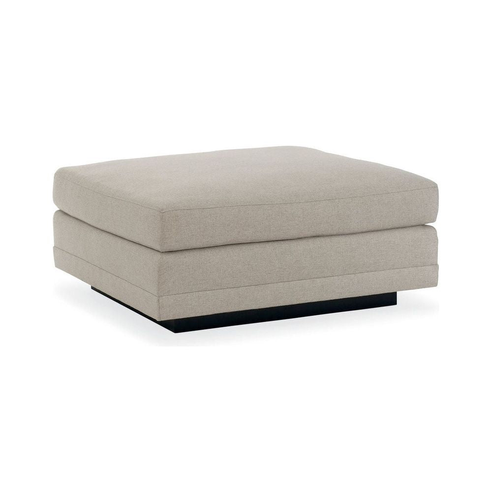 Casually elegant, this fully upholstered ottoman is designed to complement the Modern Fusion sectional. Perfectly sized, it's tailored to perfection in a neutral, menswear-inspired look with a textured tweed pattern that's touchably soft. A recessed wood plinth base in Simply Black completes this piece distinctive aesthetic style.