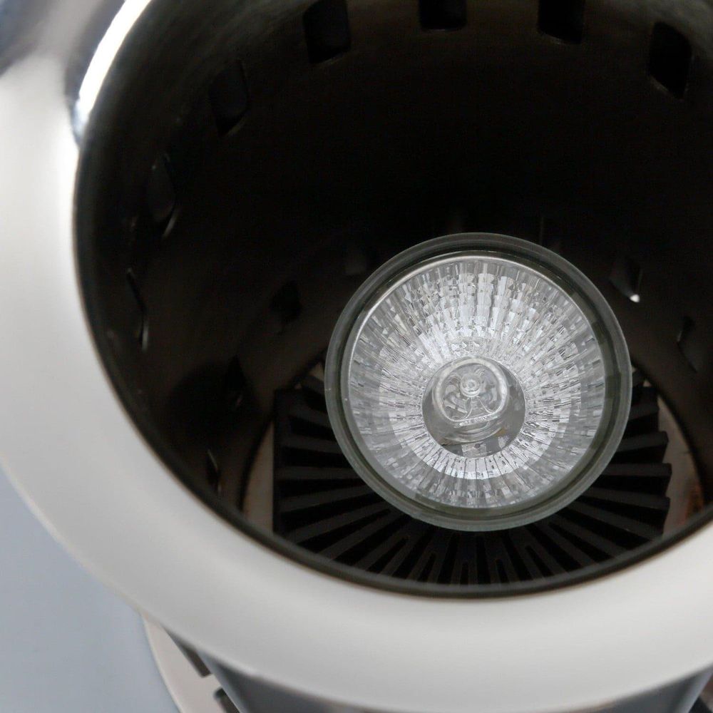 Inspired by Achille Castiglioni's original 1962 design this table lamp will add a touch of retro cool to any living space. Perched atop a column-like steel base, the deep glass bowl shade is easily adjustable with the touch of a finger for repositionable lighting. A shallow aluminum reflector bounces the light from a standard 60 watt bulb to create glowing illumination. Available in black or chrome.