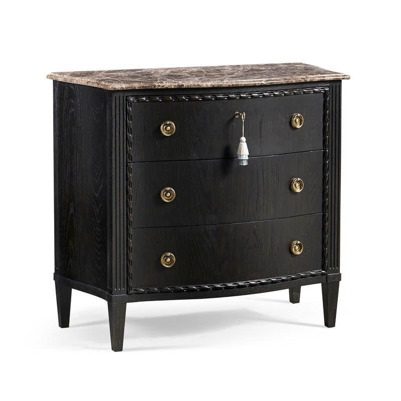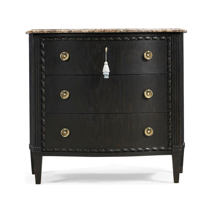 Description: Three (3) drawers for storage.Drawers are framed with a carved rope detailing.Cast brass ring pulls feature decorative backplates.Honed Emperador stone top