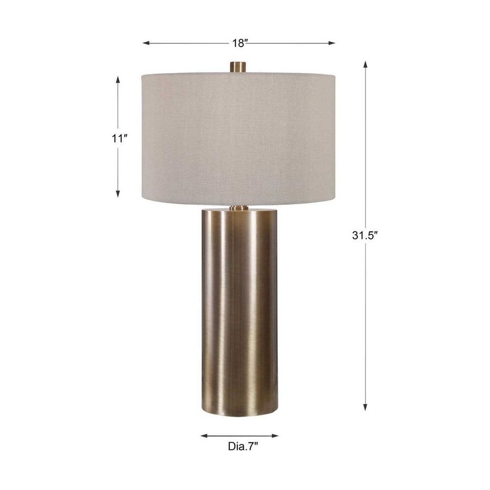 Finished in an antiqued brushed brass, this table lamp keeps it simple yet upscale with a large metal cylinder base with matching accents. The hardback drum shade is finished in a beige linen fabric.