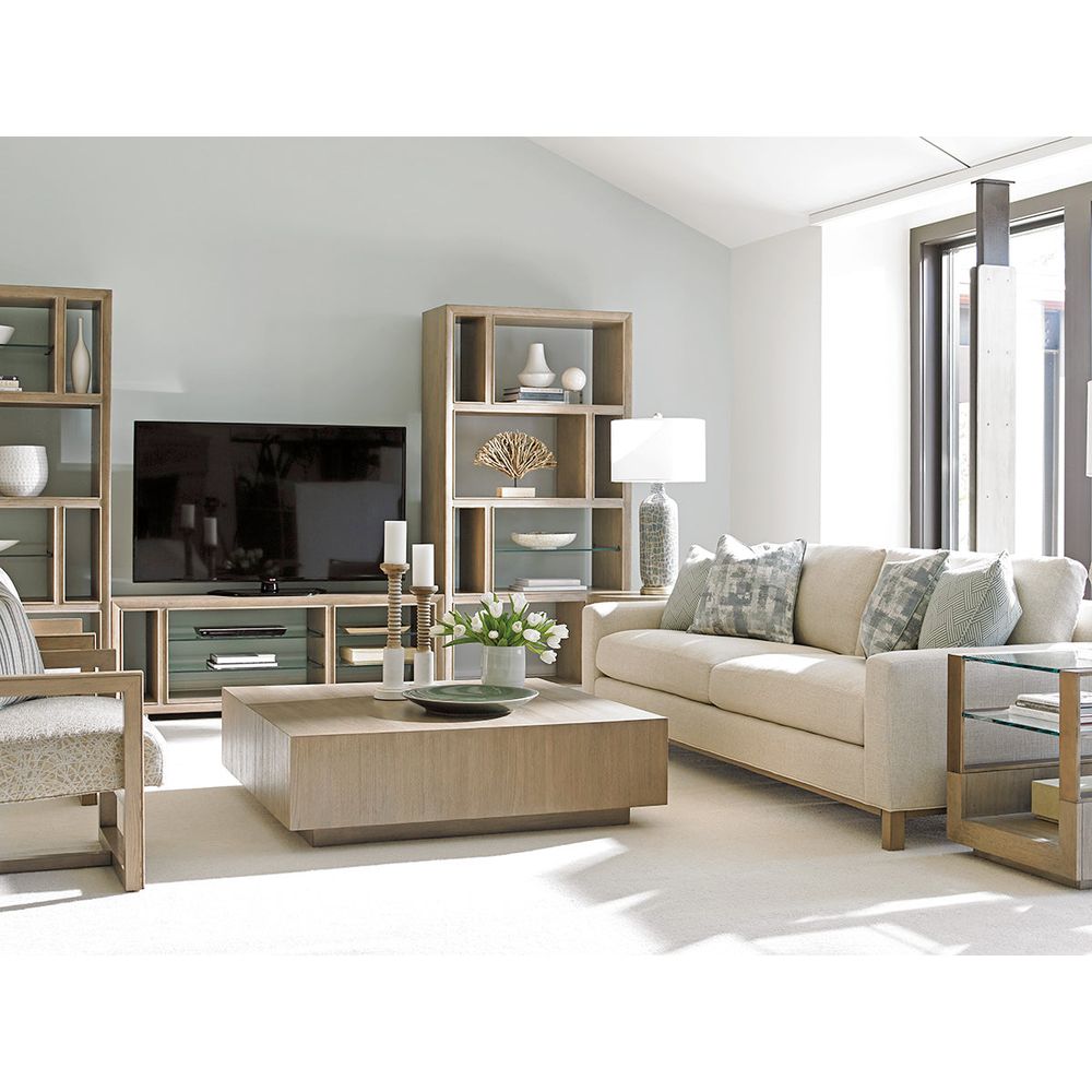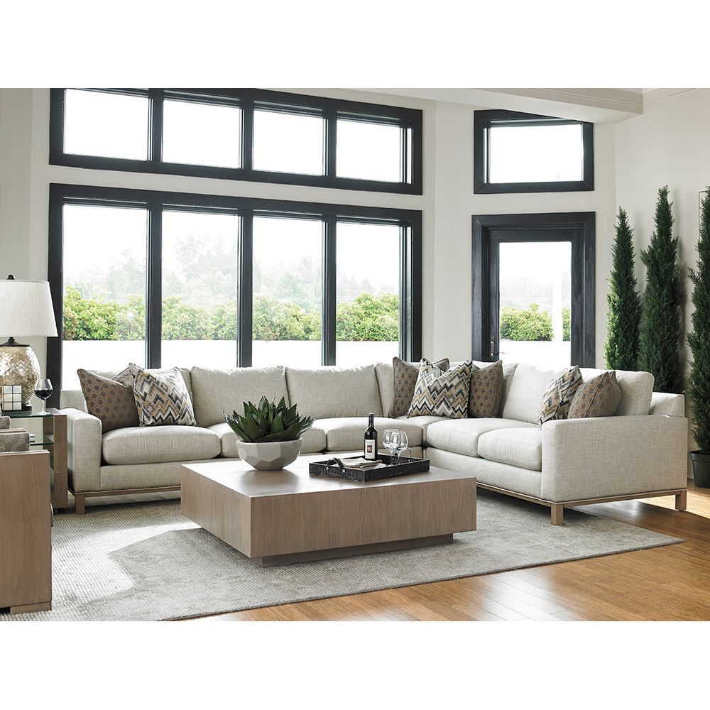 Feature 1: The 48-inch square cocktail table makes an impactful design statement and offers the scale to accommodate a pair of flanking sofas or a sofa with a pairing of chairs. The top surface elegantly showcases the soft lines of the Gray Elm veneer.