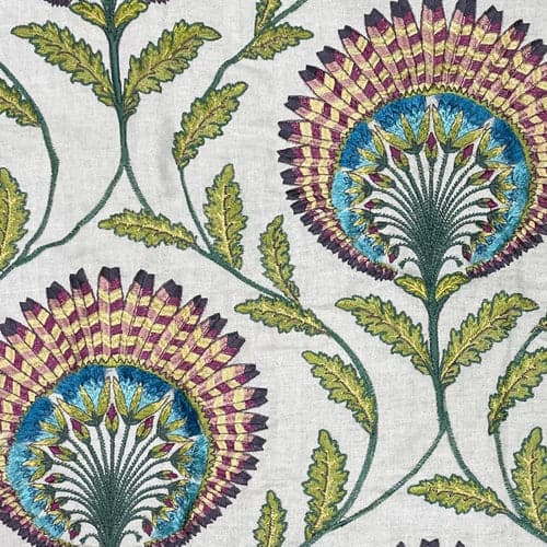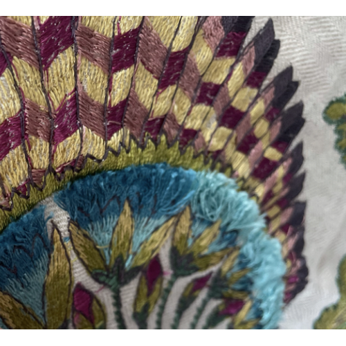 Inspired by a16th century Ottoman dish,this design means 'peacock' in Turkish. Embroidered on a herringbone ground in many colors, with decorative clipped fringe.