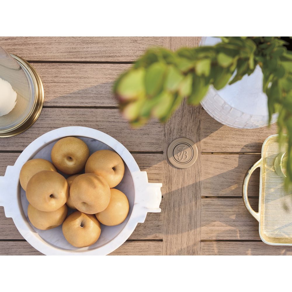 Feature 1: The 91-inch rectangular dining table features a plank top design with mitered border around the perimeter and a pass-through in the middle to accommodate an umbrella. A decorative aluminum insert with a TB monogram is included to conceal the pass-thru when an umbrella is not in use.
