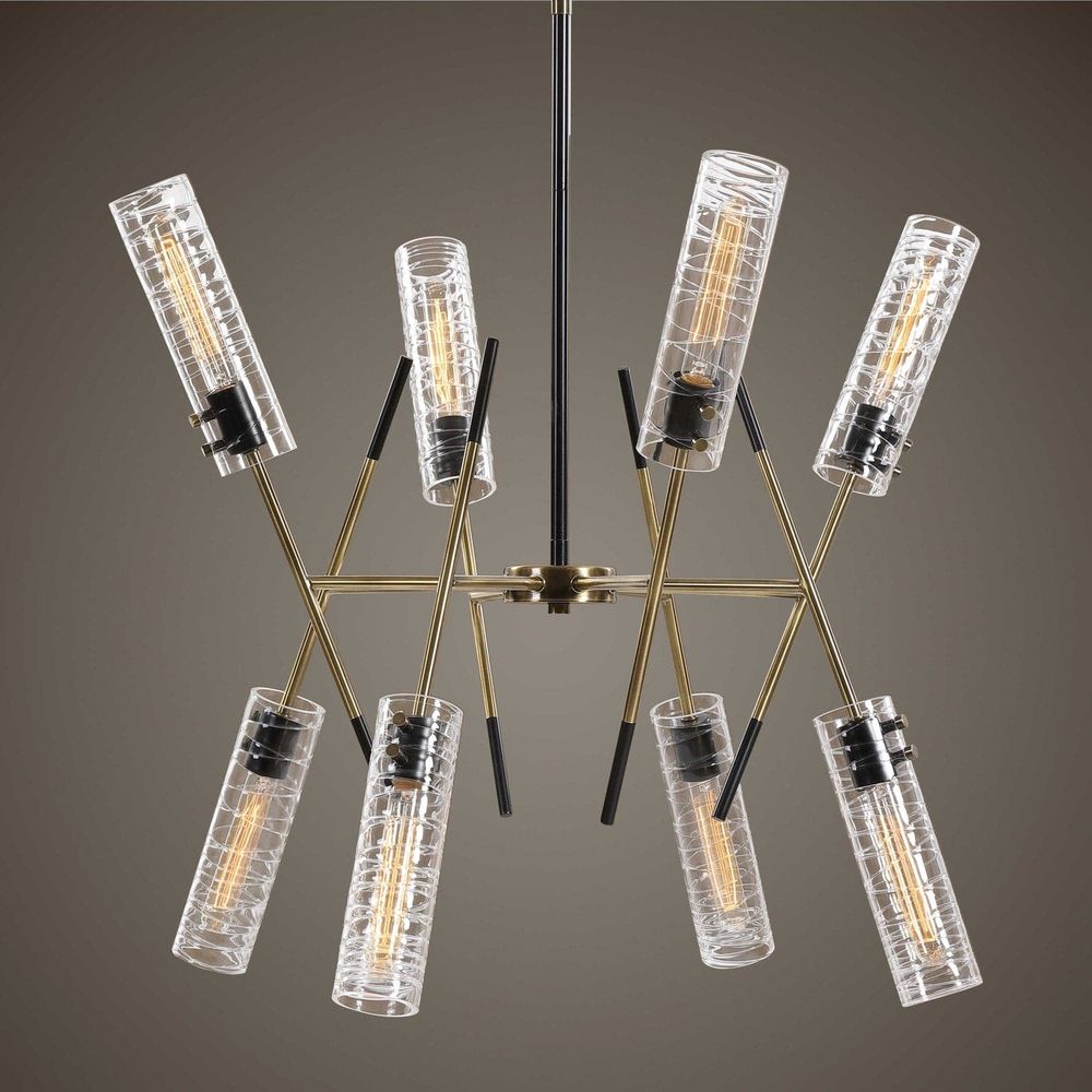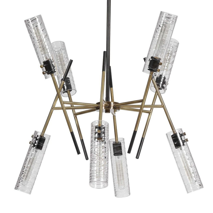 A dramatic soft contemporary look blends straight lines and linear glass to give us this eye-catching 8 Lt. pendant. Featuring a combination finish of texture black and antique brass complementing the narrow clear cylinders of glass with unique swirled thread accents. Includes 8-60 watt max Edison sockets. Supplied with 15' wire, 3-12" stems and 1-6" stem for adjustable installation.