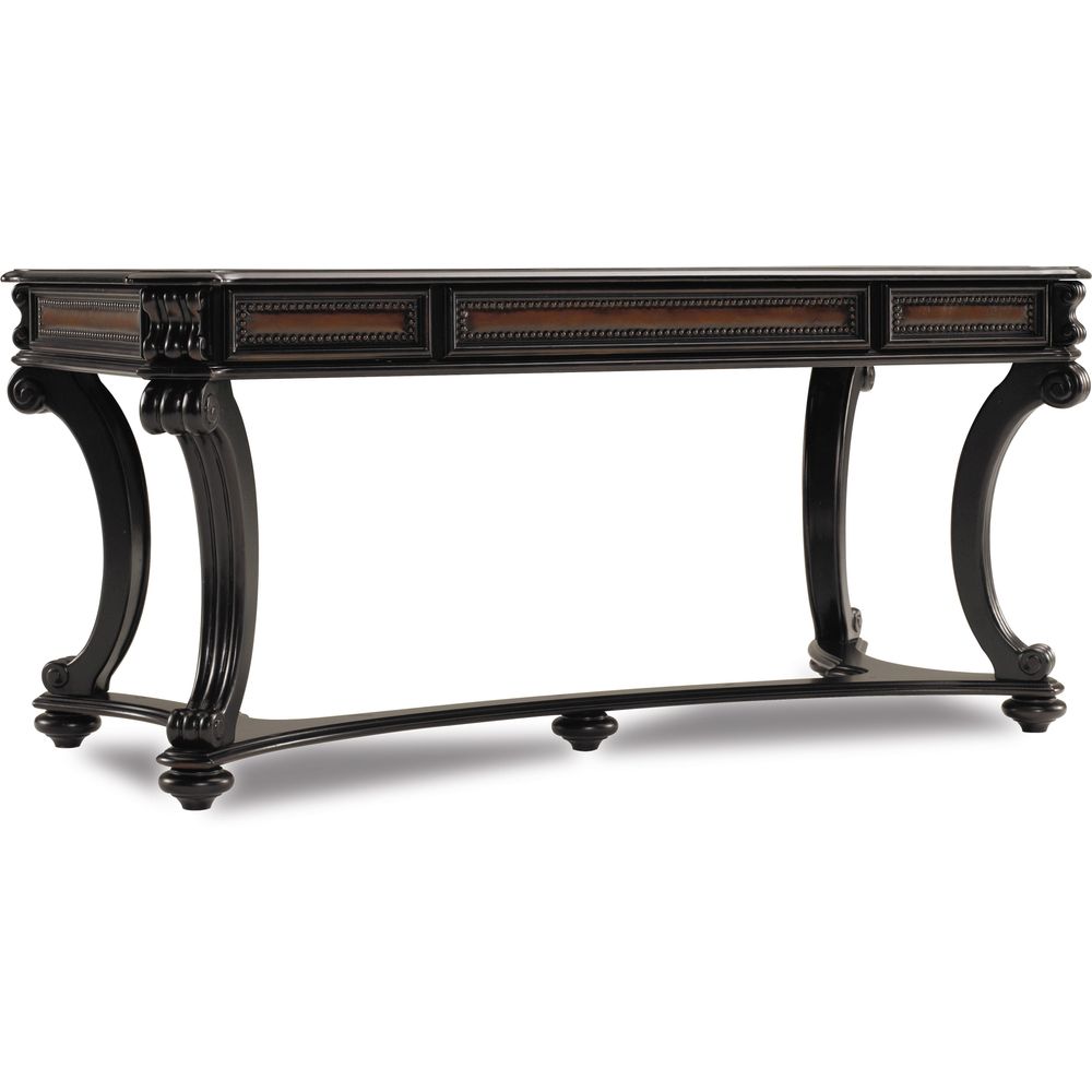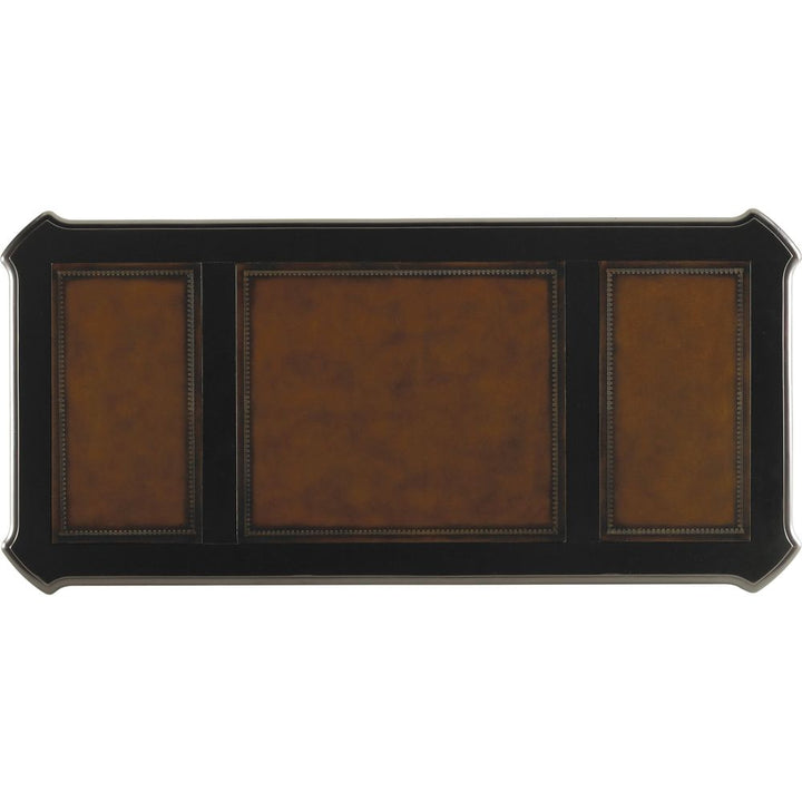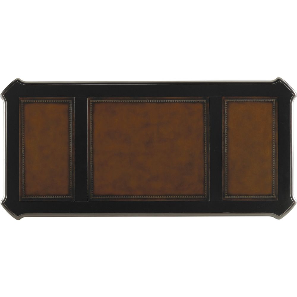 Telluride's black paint finish with heavy reddish brown rub-through, carved leather panels and nail head trim give this collection a rich masculine look.