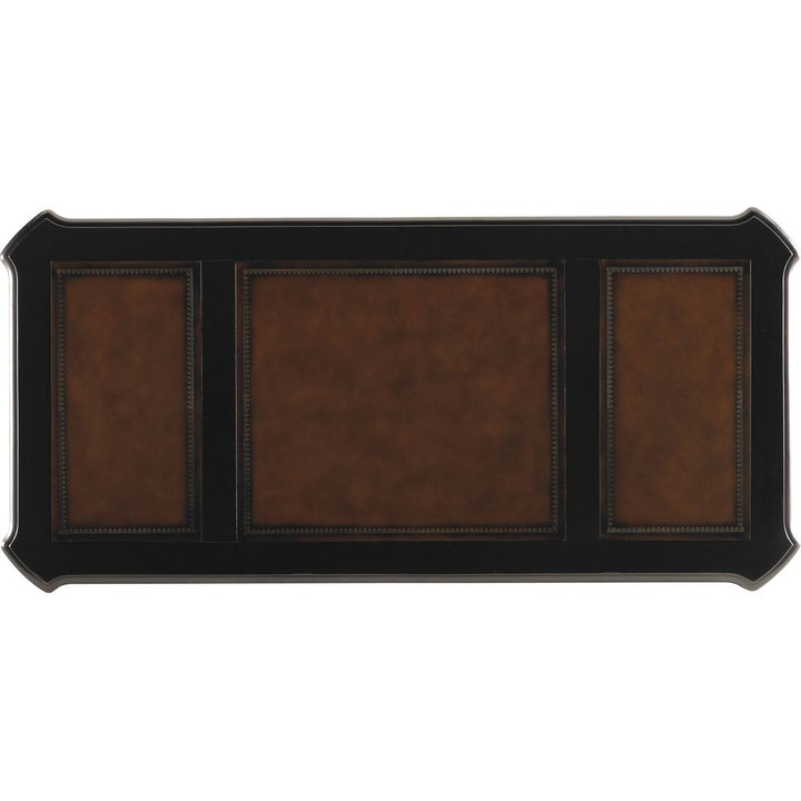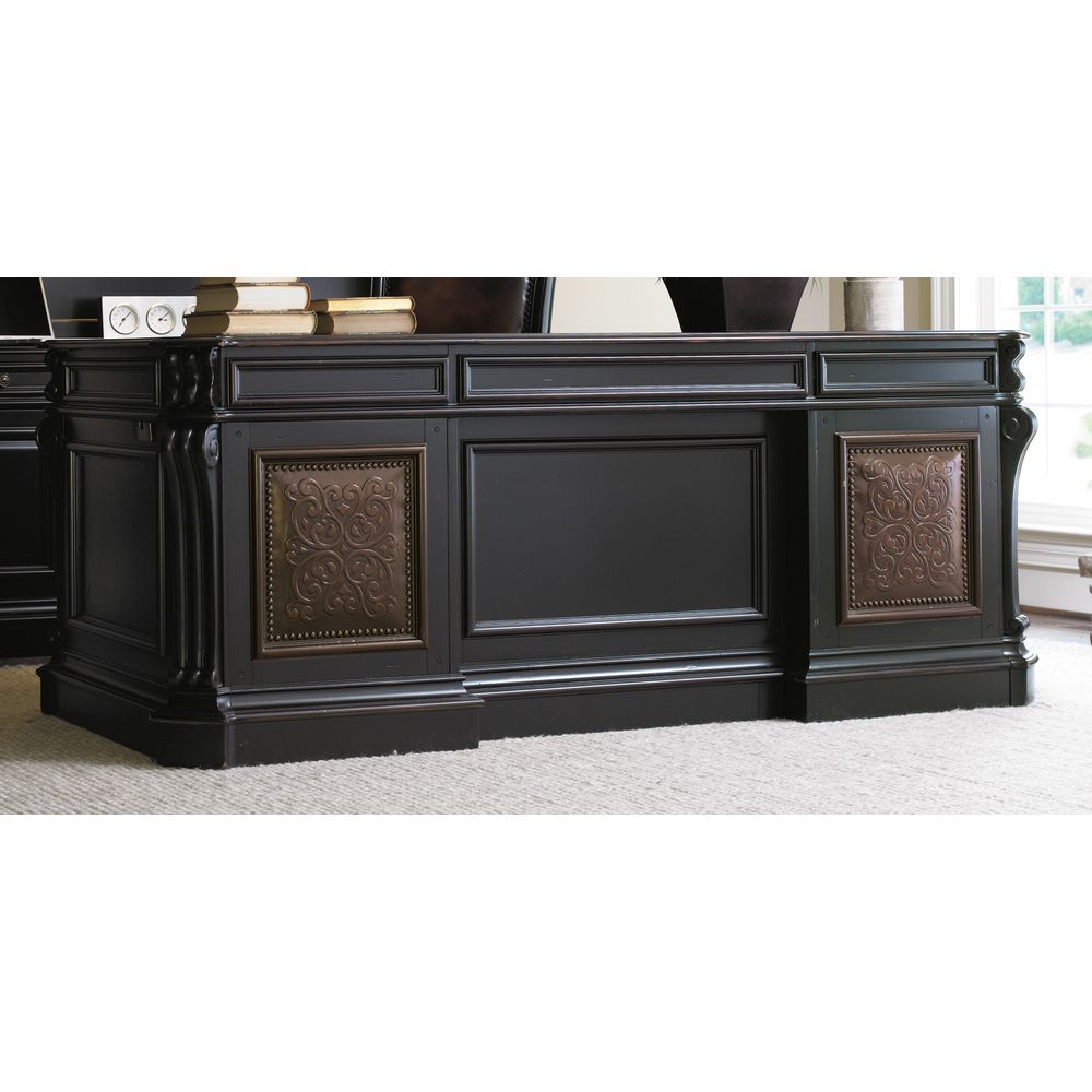 Telluride's black paint finish with heavy reddish brown rub-through, carved leather panels and nail head trim give this collection a rich masculine look.
