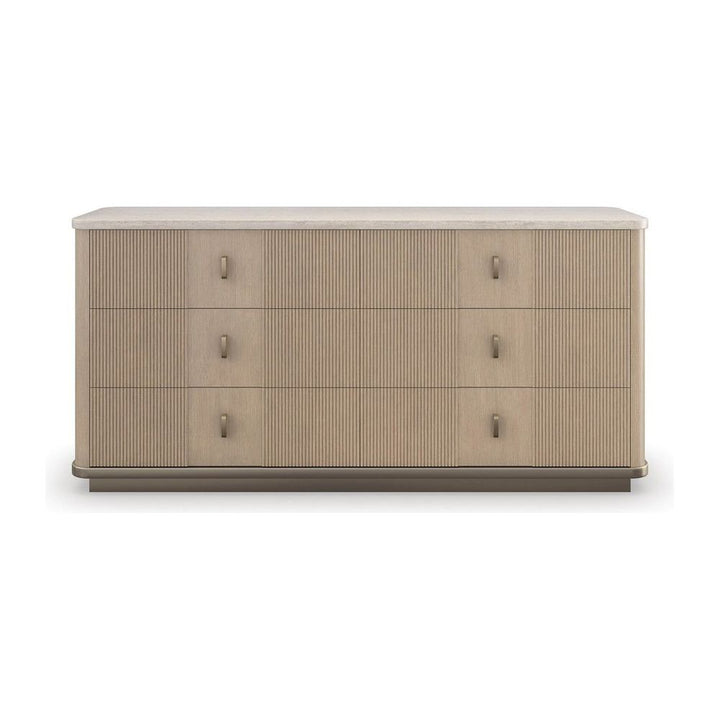 Tactile reeded drawer fronts in a Sun Drenched Oak finish create visual rhythm, quietly contrasted by a creamy Travertine stone top. Rounded corners and bronze drawer pulls with a subtle contour soften its linear form and add a touch of warmth. Features six spacious drawers with Linen-painted interiors for neatly keeping bedroom essentials. Style as a console to make a striking statement.