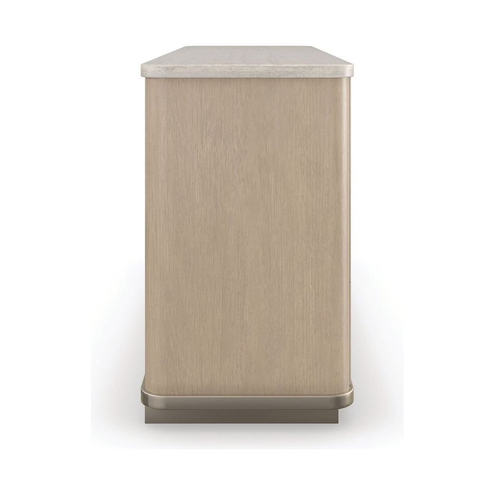 Features: Cream Travertine stone top.Case finished in Sun Drenched Oak.Six drawers with bead molding and soft close undermount guides.Base finished in Neutral Metallic.Interior in UV Linen.