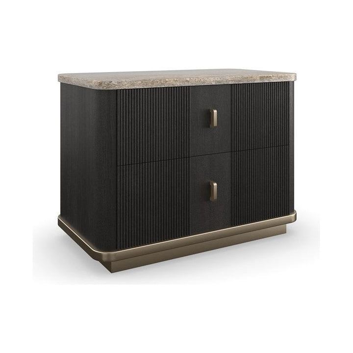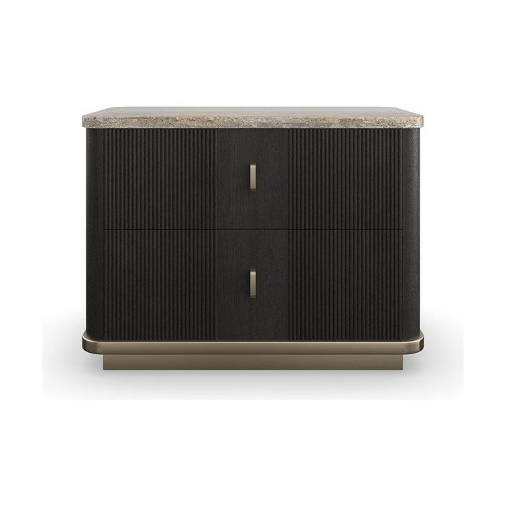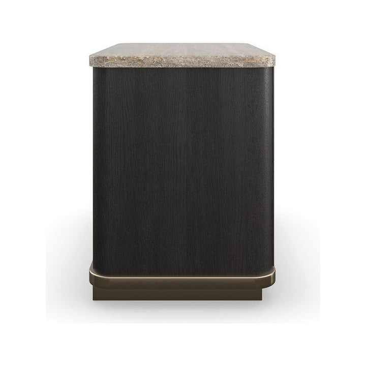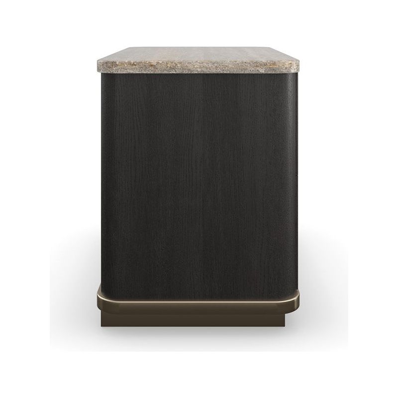 Features: Dark Travertine stone top.Case finished in Black Stained Ash.Two drawers with soft close undermount guides.Bottom frame finished in Neutral Metallic.Drawer interiors in Black Stained Ash.Wire management access.Top is natural stone. Natural variations in color, veining and spotting will vary from piece to piece.