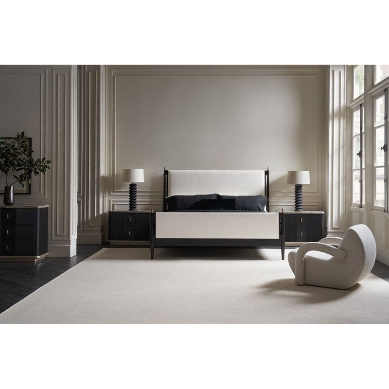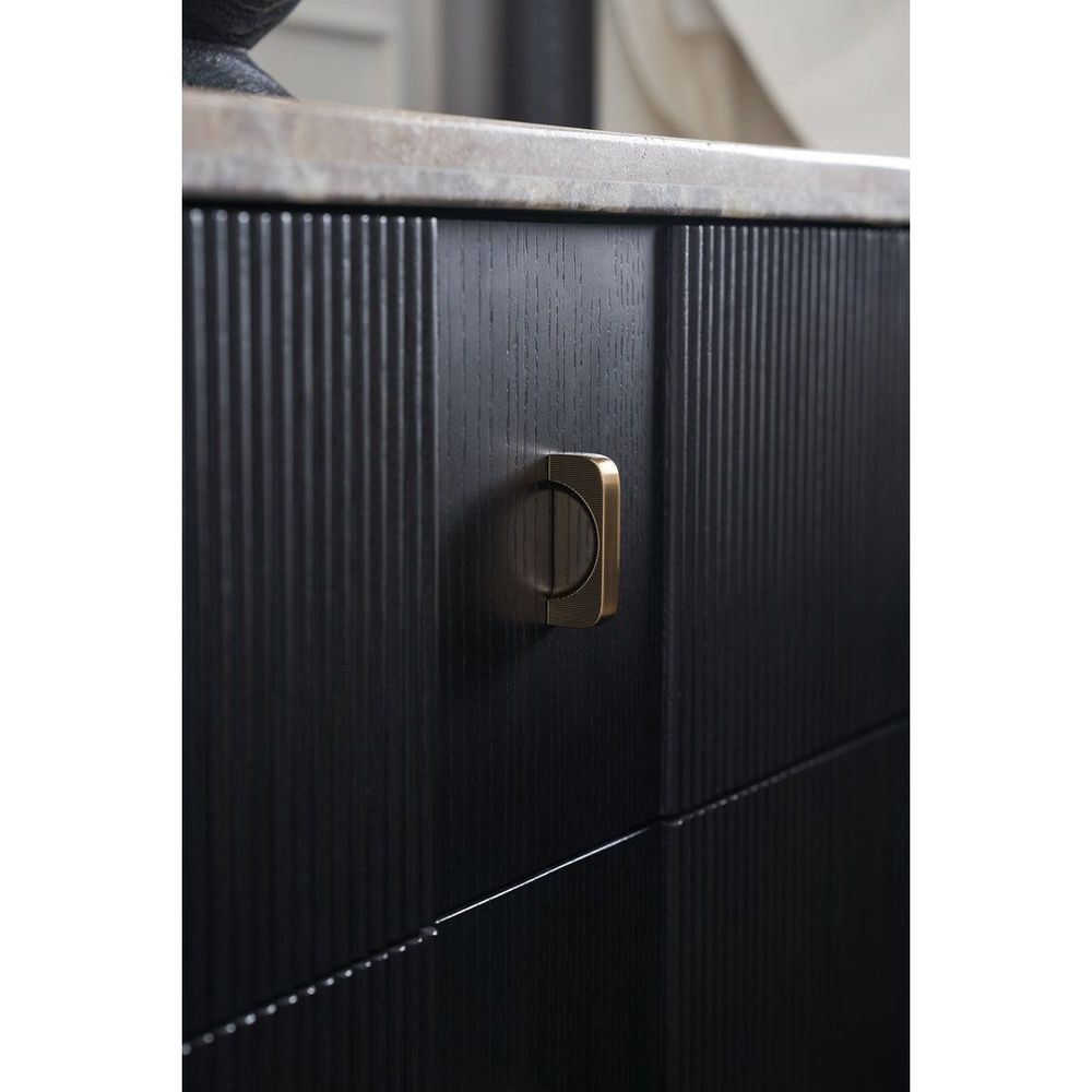 The natural beauty of travertine stone is punctuated by the visual rhythm of reeded drawer fronts in a Black Stained Ash finish. Rounded corners and bronze drawer pulls with a subtle contour soften its linear form and add a touch of warmth. Features painted drawer interiors and access along the back for wire management.