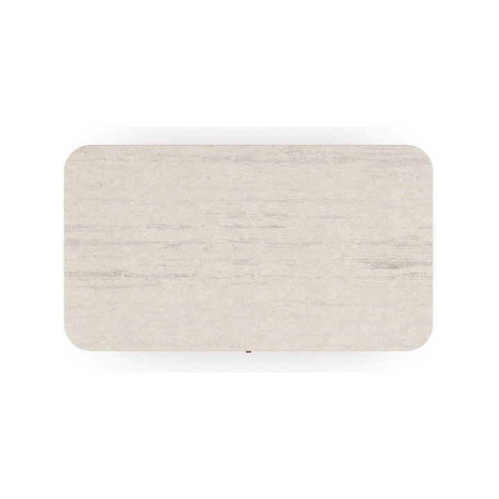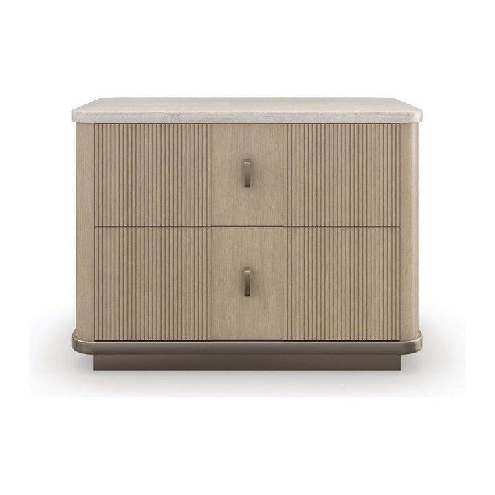 Features: Cream Travertine stone top.Case finished in Sun Drenched Oak.Two drawers with soft close undermount guides.Bottom frame finished in Neutral Metallic.Drawer interiors in UV Linen.Wire management access.