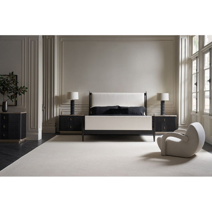 With flowing modern lines and a rich use of material, the Rhythm queen bed brings a simple yet sophisticated cadence to bedroom interiors. Tailored in a luxurious ivory boucle fabric, its clean, parsons-style headboard lends soft contrast to a Black Stained Ash wood frame. Metal finials in a Lucent Bronze finish accentuate subtly tapered posts with a note of luxe.