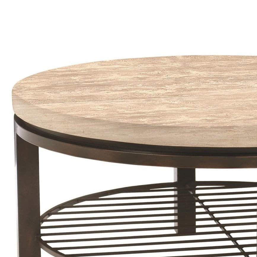 The Tempo round cocktail table is a unique modern piece with a clean design blending natural and industrial elements for a warm, rustic feel. A tubular steel base in a dark brown finish supports a travertine stone top that appears to float above its sturdy base. A gridded solid iron bottom shelf allows for additional storage and display.