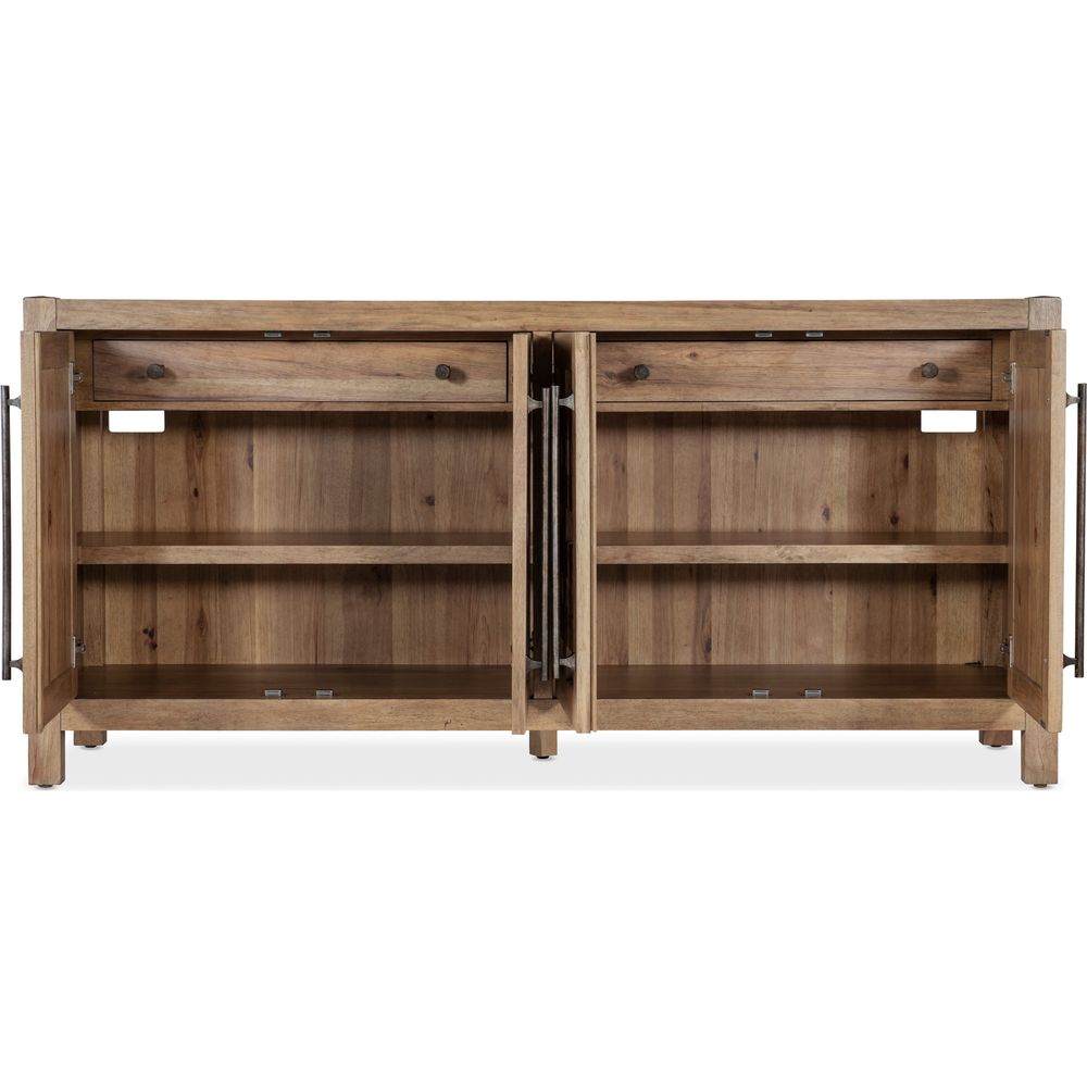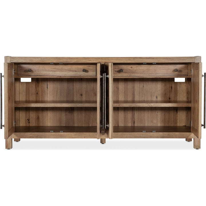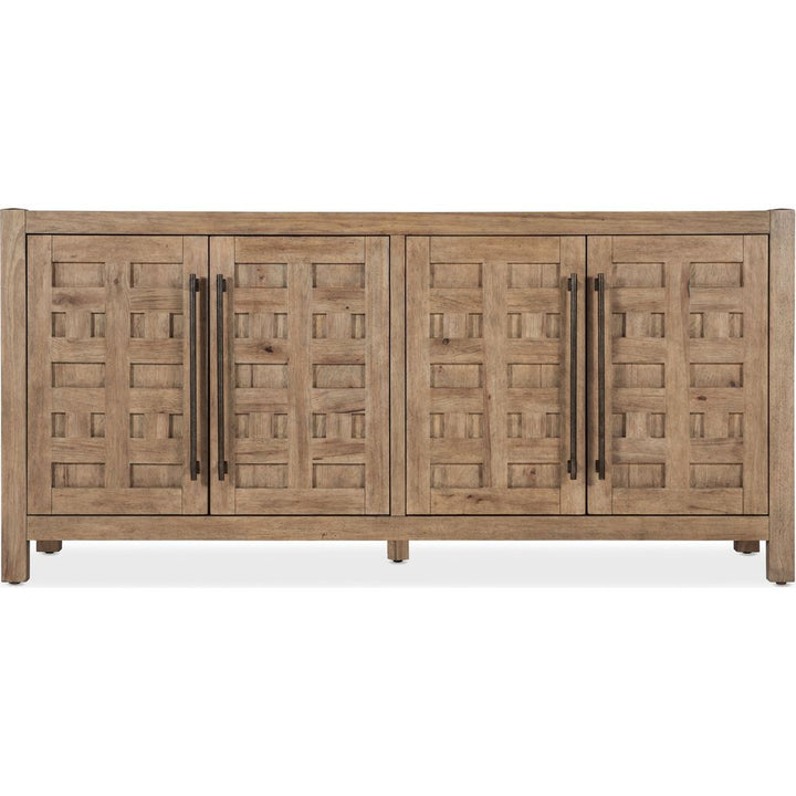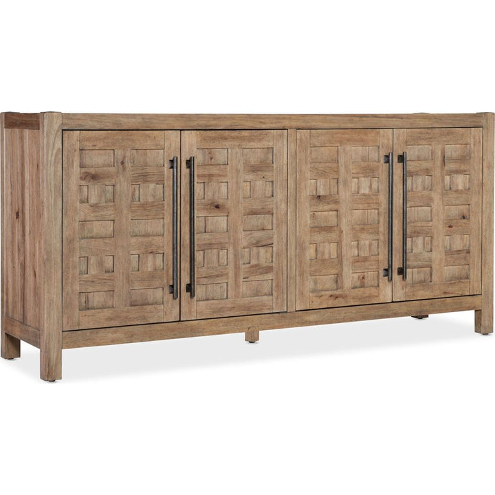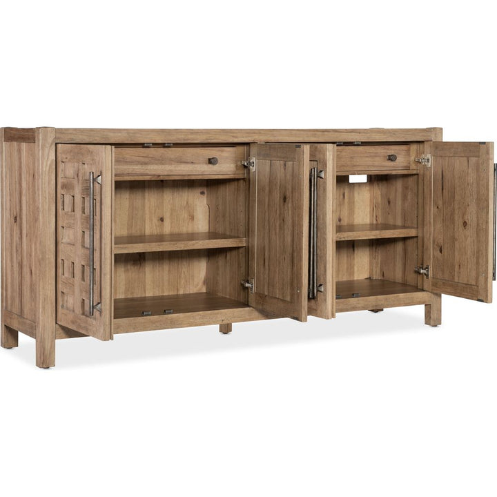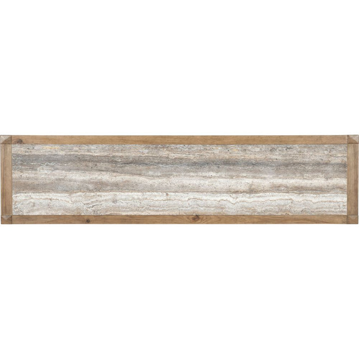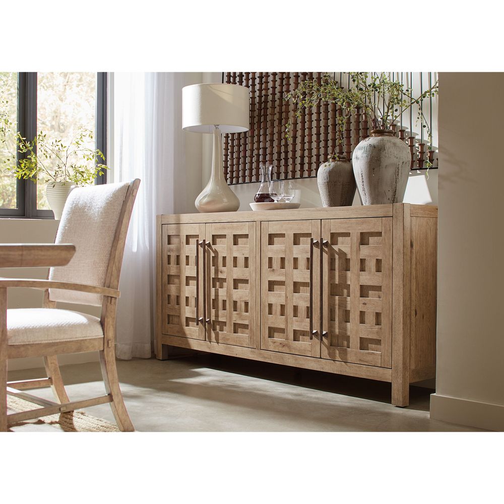 Description: Inspired by California wine country and influenced by the quaint bungalows and craftsman architecture of the region, the Terrace Row Buffet is made of Pecky Hickory and White Oak Veneers with a honed gray travertine insert on the top. The four doors with soft close hinges feature cutout fretwork door fronts. There's one self-closing drawer behind each pair of doors, and the left drawer has a removable black felt silverware tray while the right drawer has a removable black felt liner. There's one adjustable wood shelf behind each pair of doors. The light-and-airy Sonoma finish is reminiscent of the crisp white wines of the Sonoma region and complemented by hammered metal bar pulls and knobs.